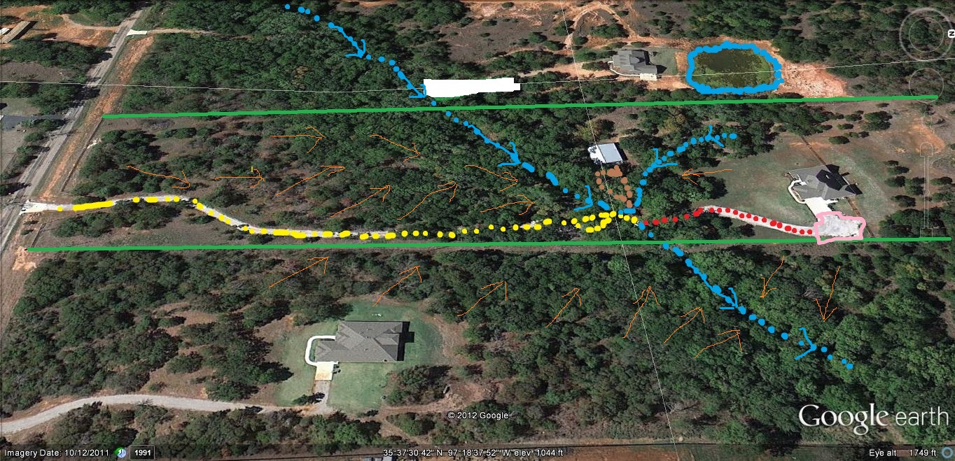 Here is a side shot of our property showing the overall project area. The view is looking west. At the end of the drive, the pink area just off the garage parking pad would be area #1, about 1700sqft. The red area would be the next area of focus, about 350ft in distance, down to the creek crossing. That area would be its own area of focus, again about 1500sqft in area. Then the final stretch back to the road, would be entirely uphill, and about 6-700sqft in length. The orange arrows denote the flow of water, which you can tell, wants to run across and down the long hill of the drive.