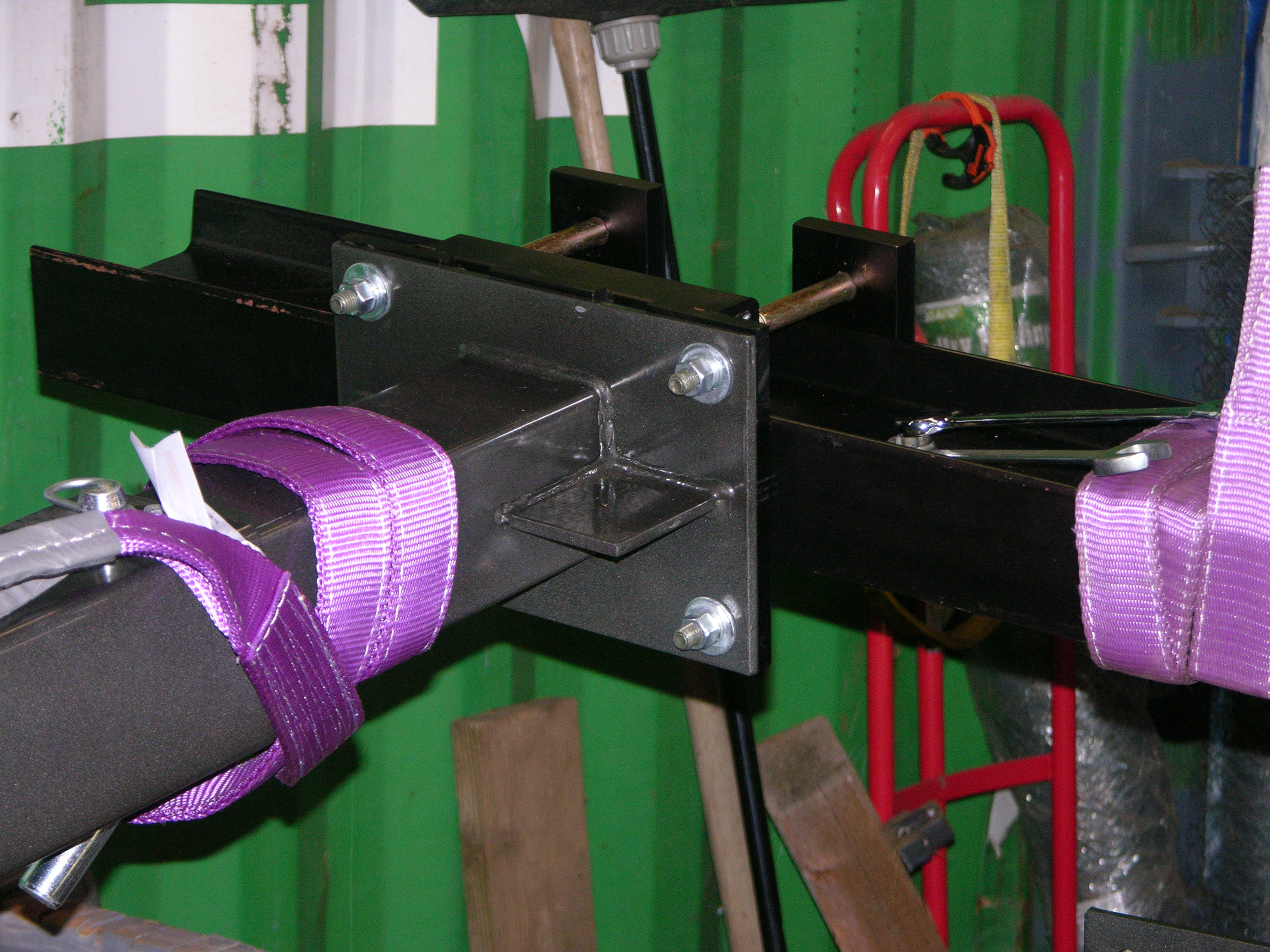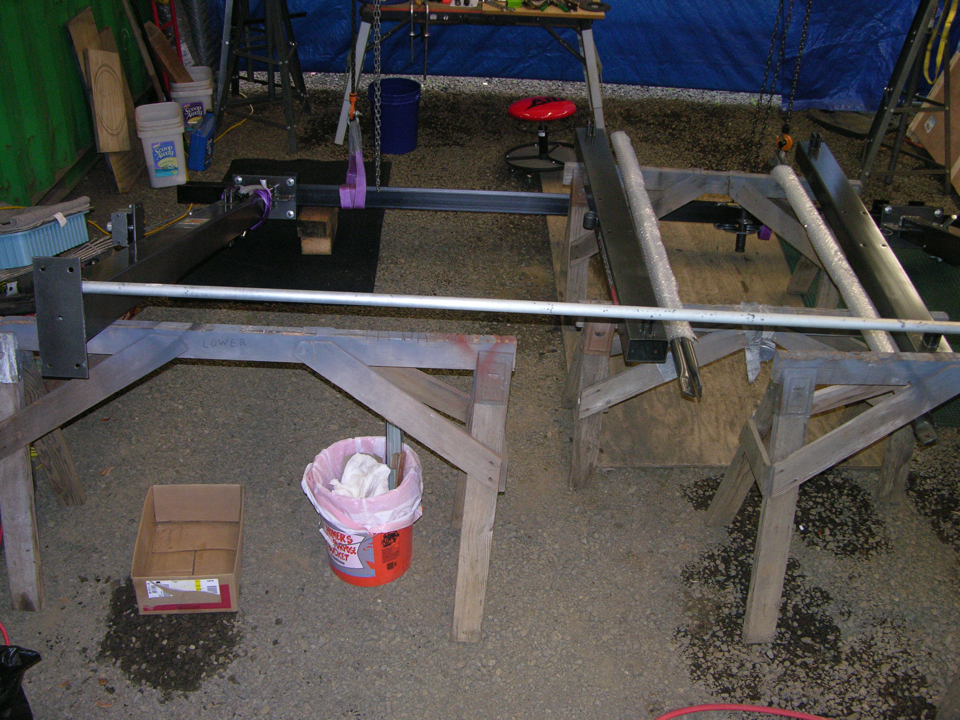 The height adjustments are kinda hokey, I can see a pair of air/hydraulic shop crane jacks with "two-fer" fork lift type chain doublers replacing those if I need to change heights much -