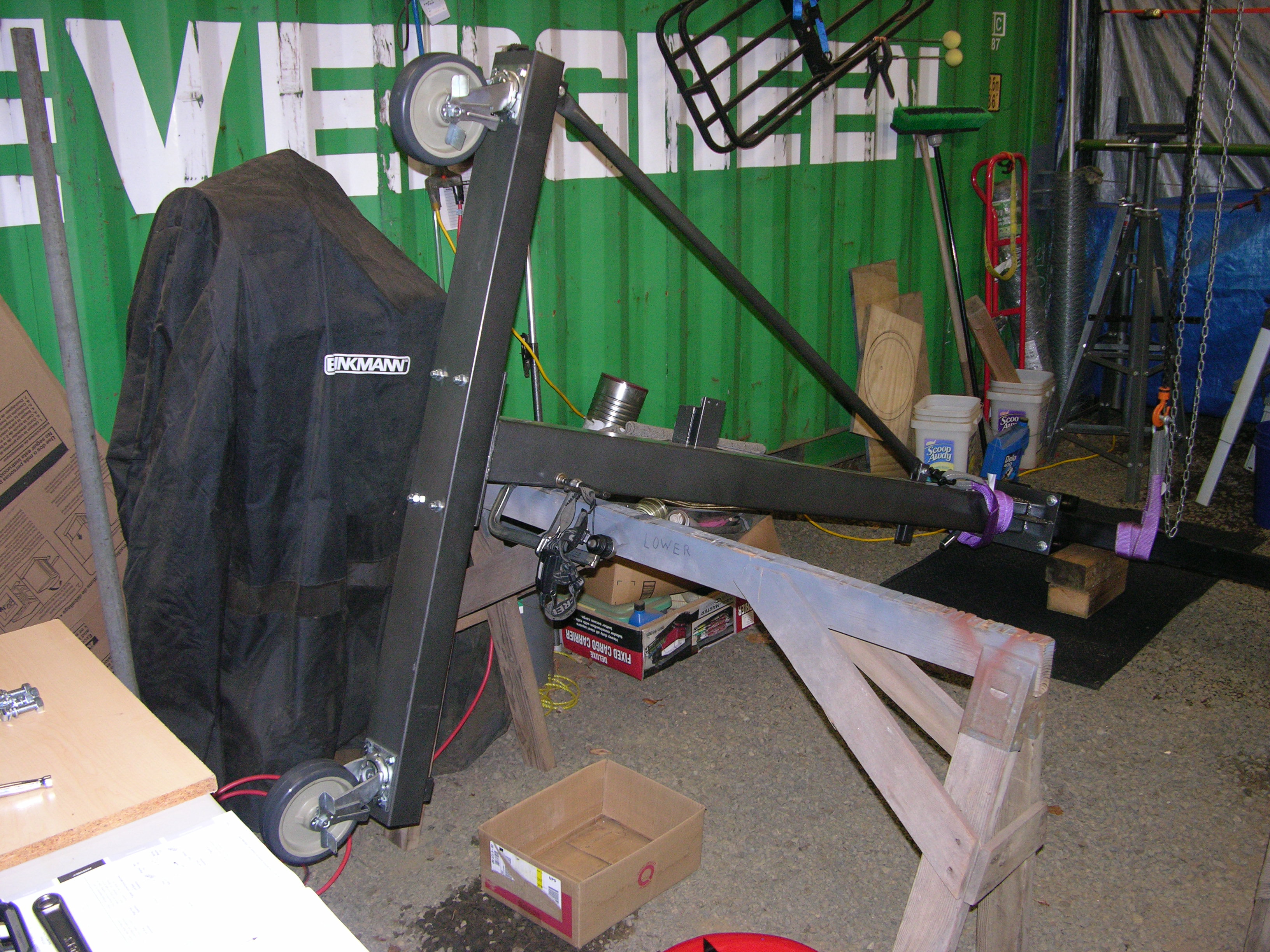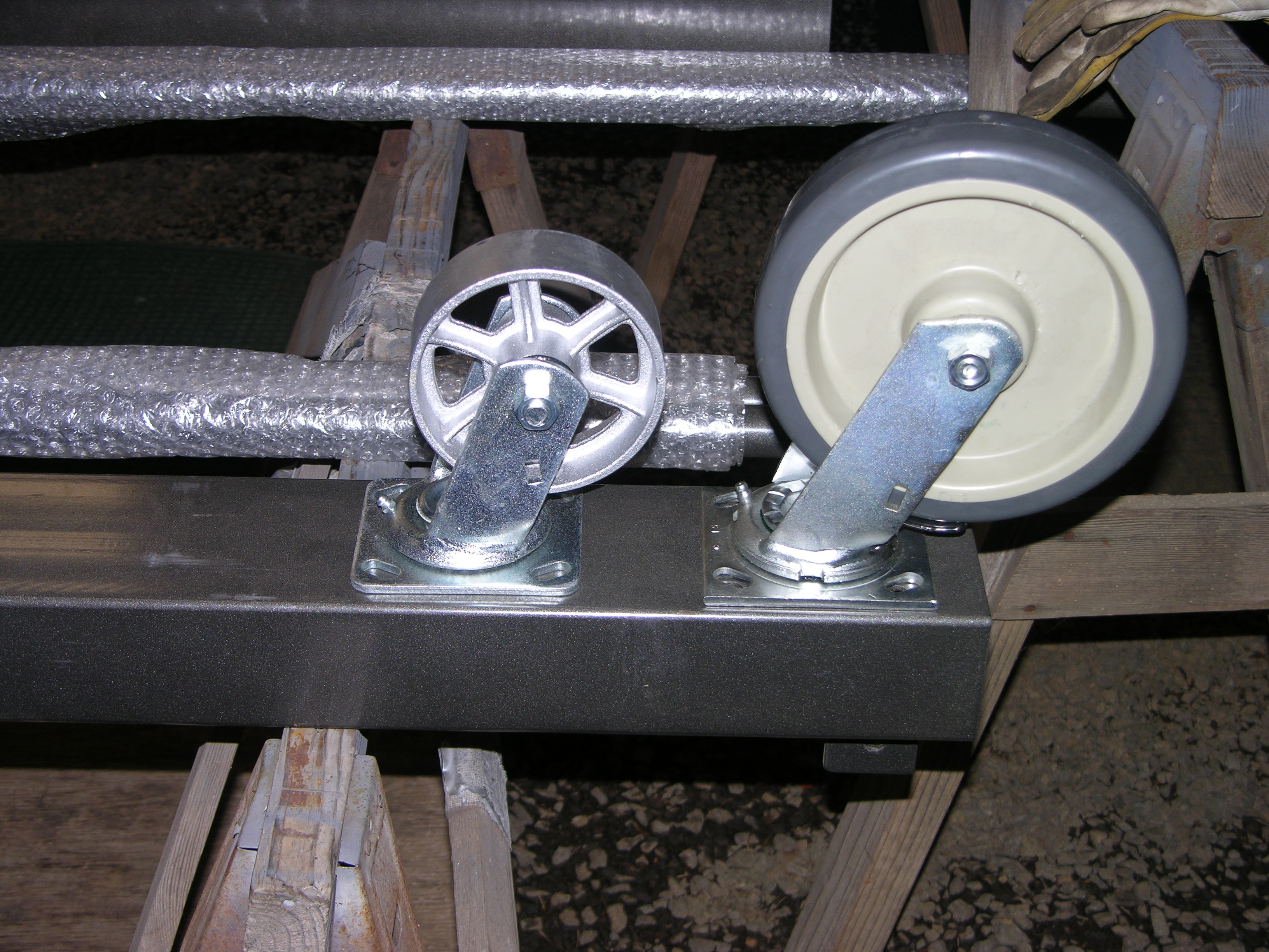 The new heavier beam is also longer, gives me 2 feet more between posts (needed for some of the operations I need to do on the 580B) - the casters raise things by 3", don't care 'cause even with the smaller ones it wouldn't go thru a normal garage door anyway - the area the crane's in now has 11' headroom and the crane will extend to 150" (AKA, 12'6" or 3,810mm ;) )overall, so my roof is the limiting factor in that area.