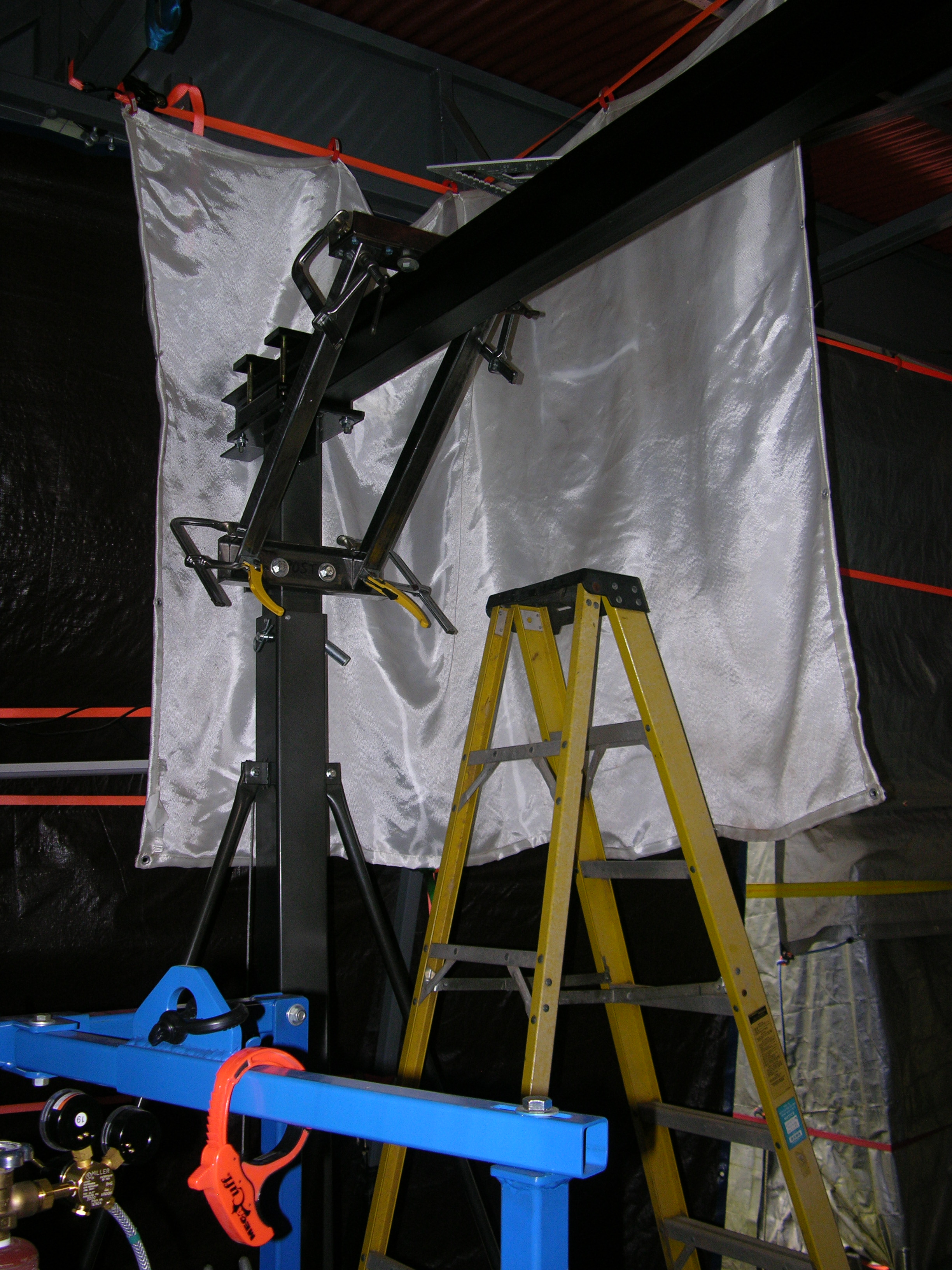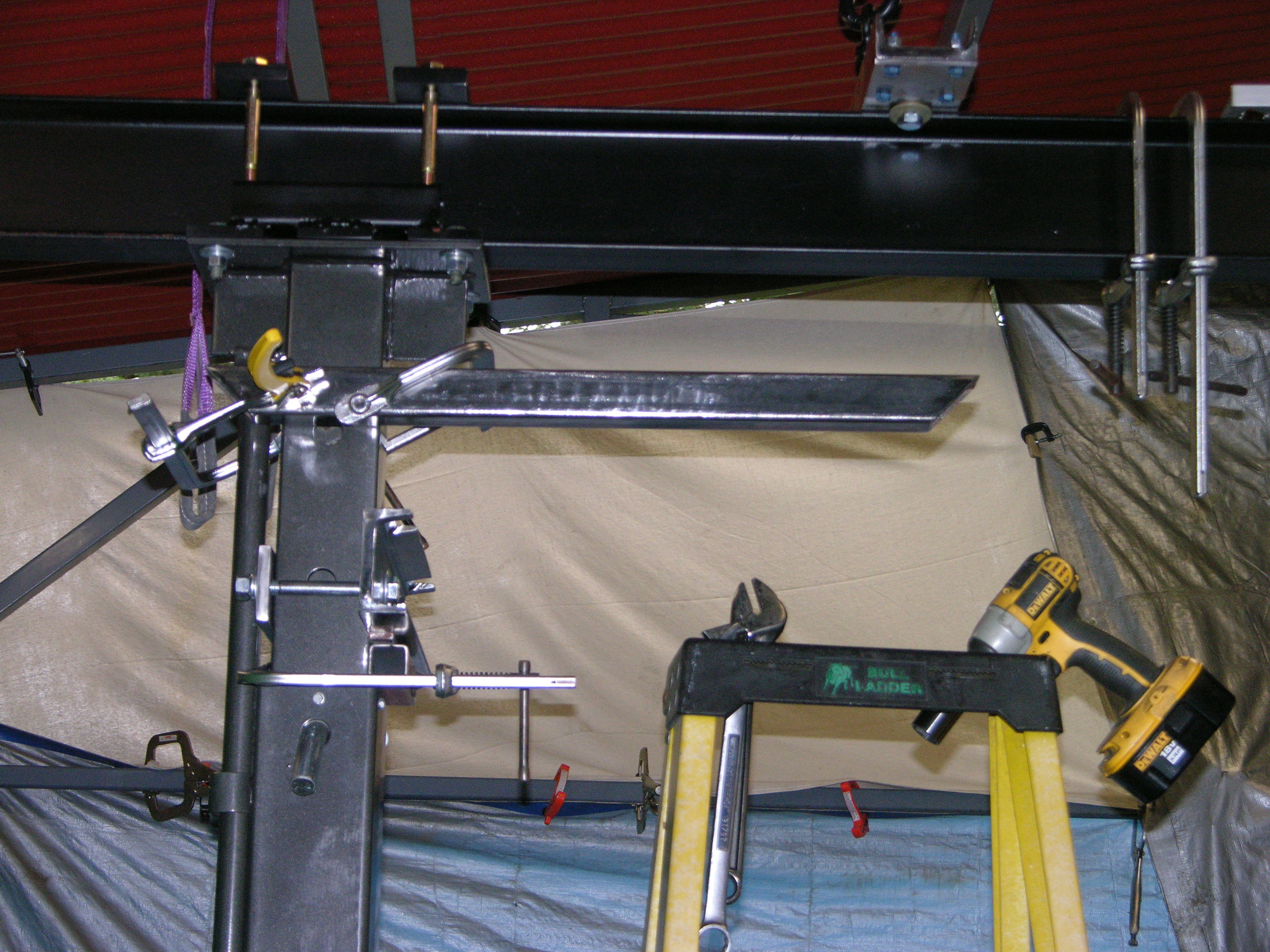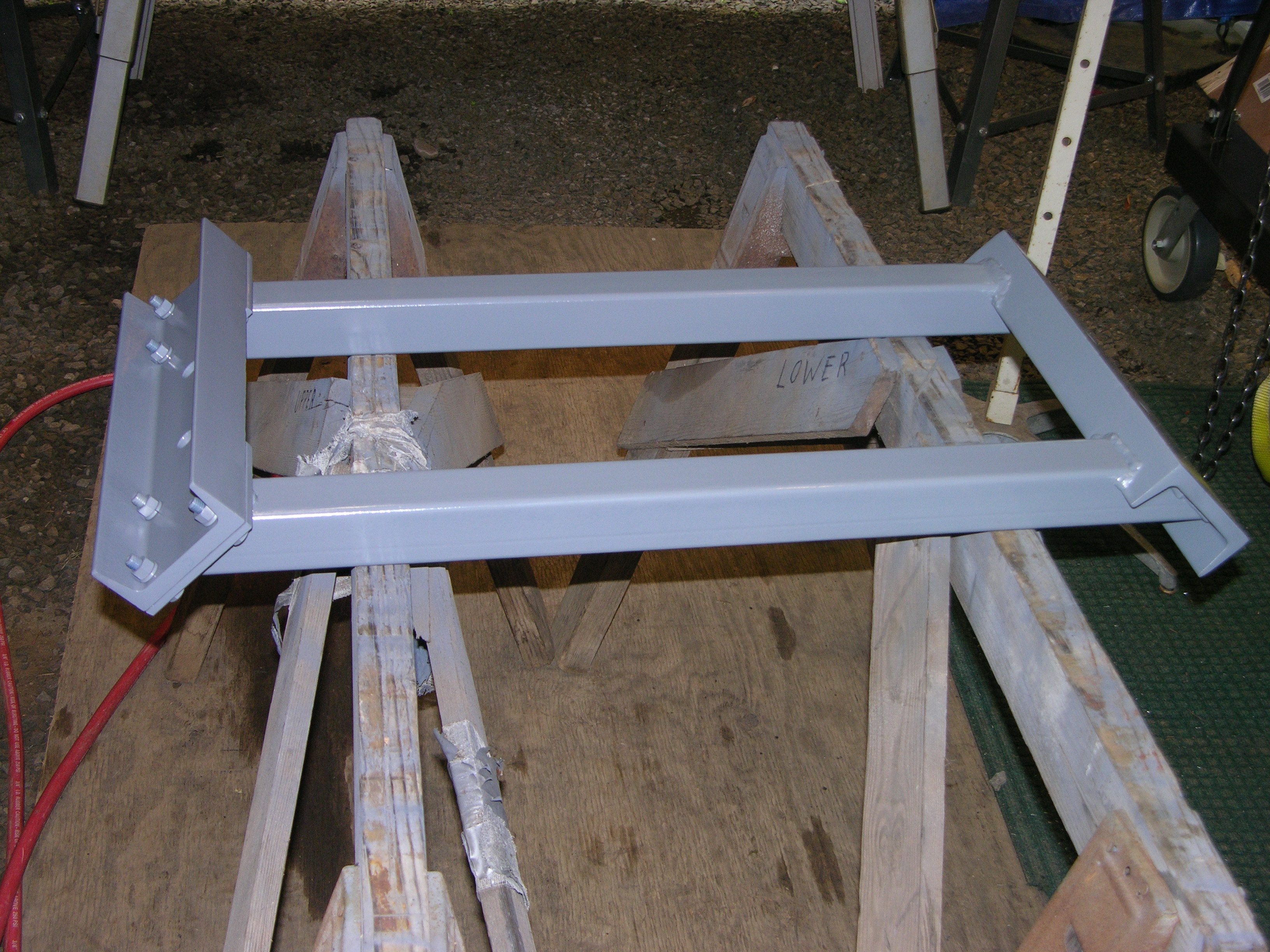 Fixed ANOTHER problem (of my own making) today; I had made the diagonal braces so the upper C channel spreader BOLTS up to a pair of 1/4"x4"x4"flat plates, which are welded to the diagonal tubes - otherwise, if I needed to adjust OR remove those braces I'd have to disconnect the upright posts COMPLETELY from the I beam - (pic is BEFORE welding)
