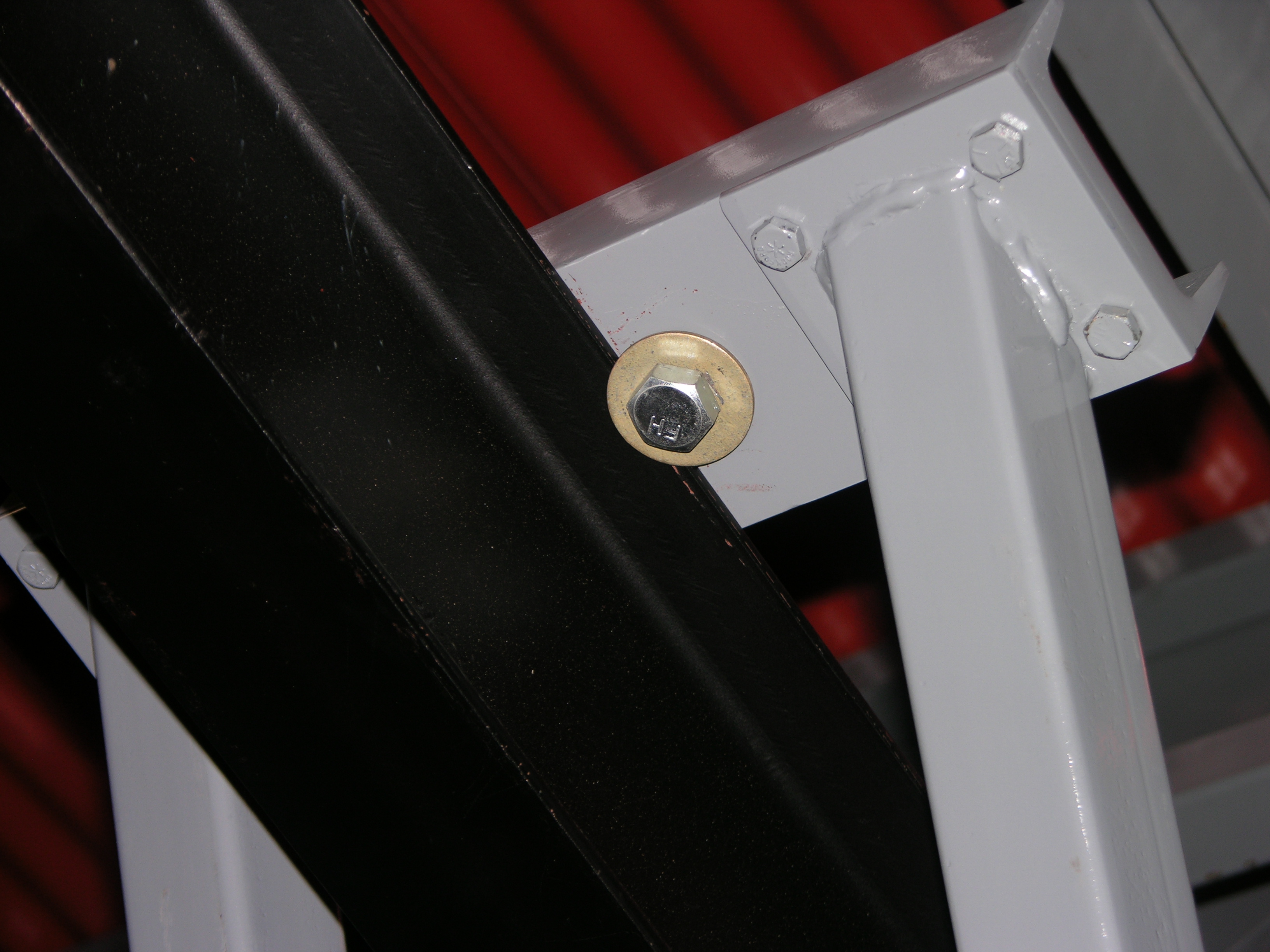 After all 8 bolts are in and tight (holding the upper spreader to the rest of the brace) it's time to tighten the lower spreader to the vertical post - this will pull the upper spreader into final position - DSCN3235.JPG