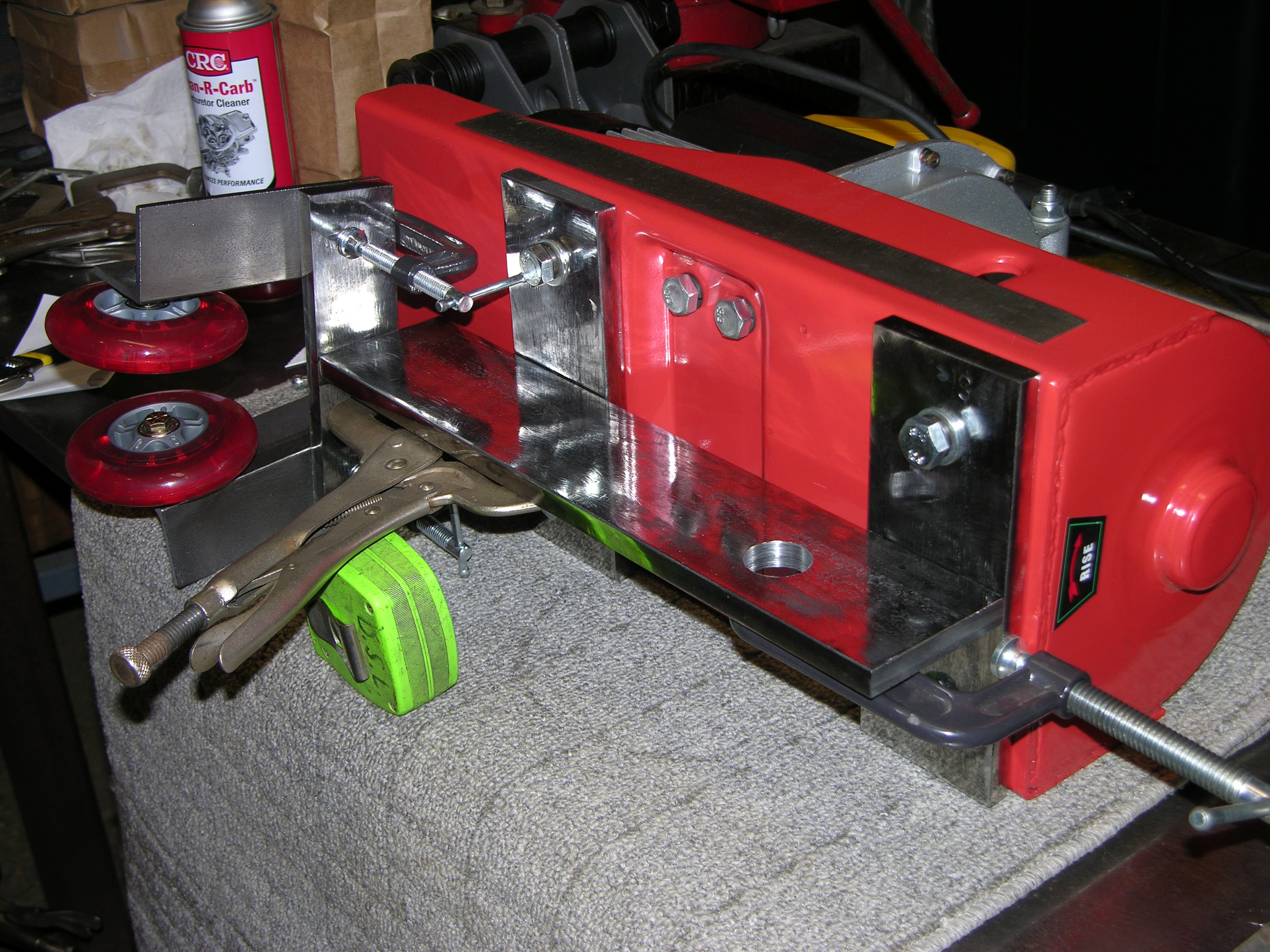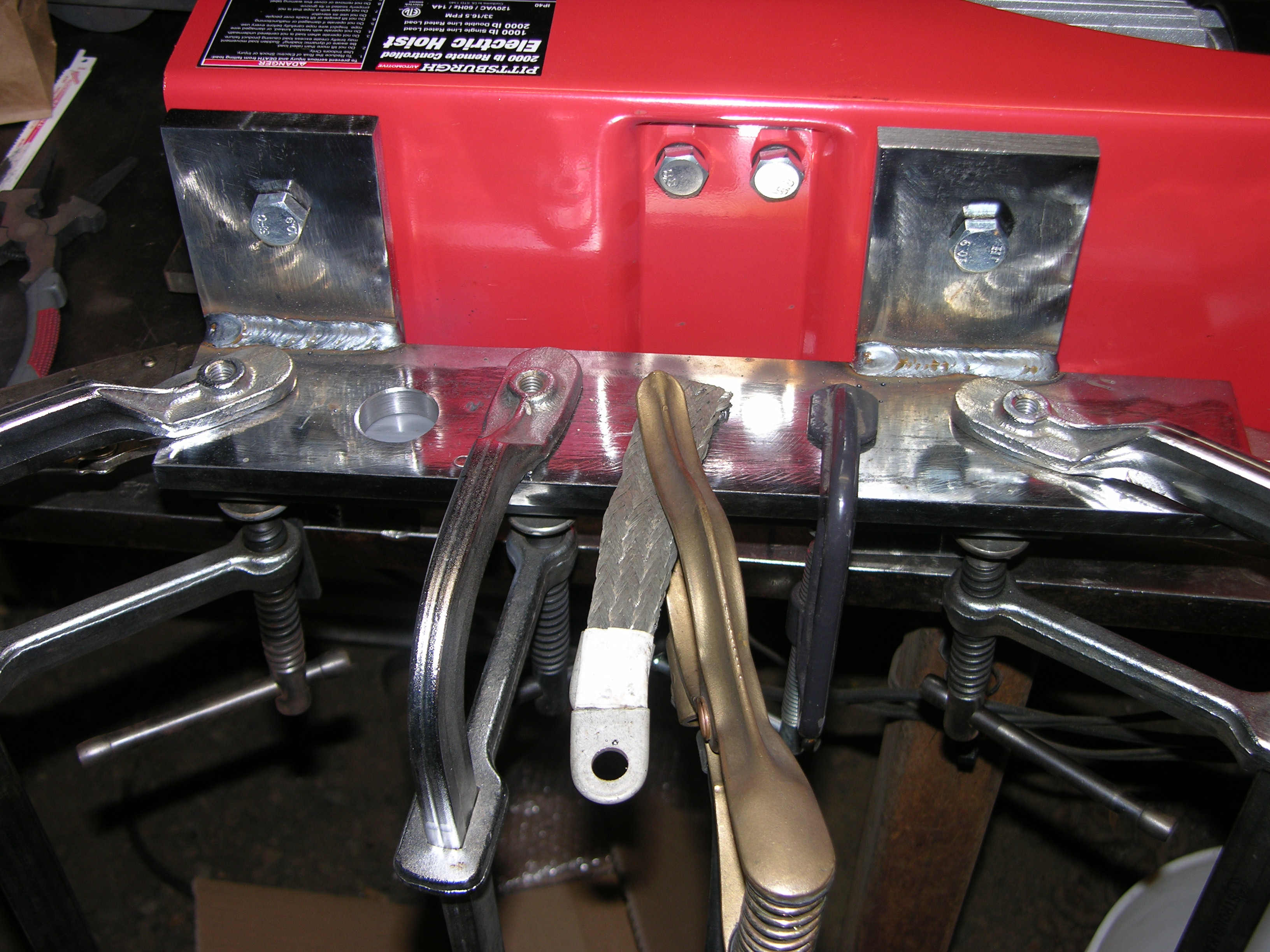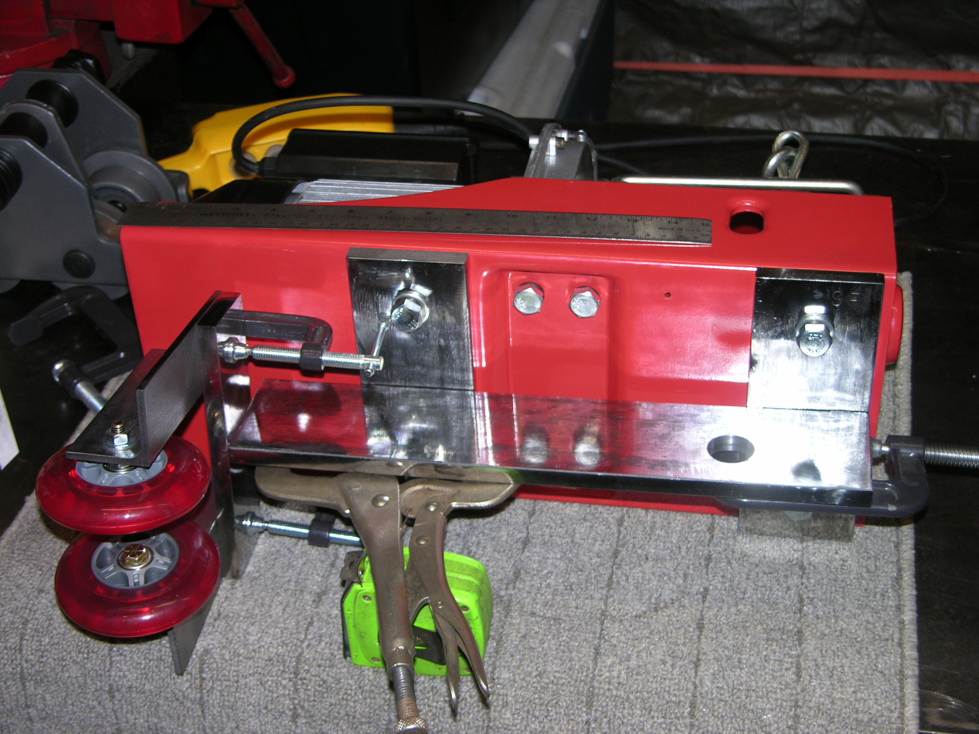 The two crossbars are bolted where the factory brackets normally go; needed longer M12 x1.75 bolts because of the 1/2" thickness instead of about 3/16" - the BIG hole is where the 1 ton trolley shaft goes thru. That'll support the lifting load, and the 2 inline skate wheels will only keep the motor end from sagging down when moving along the I beam unloaded - DSCN3248.JPG - The 1 ton trolley isn't shown here, I couldn't keep all the pieces in place (welding some of 'em will probably help :laughing:)