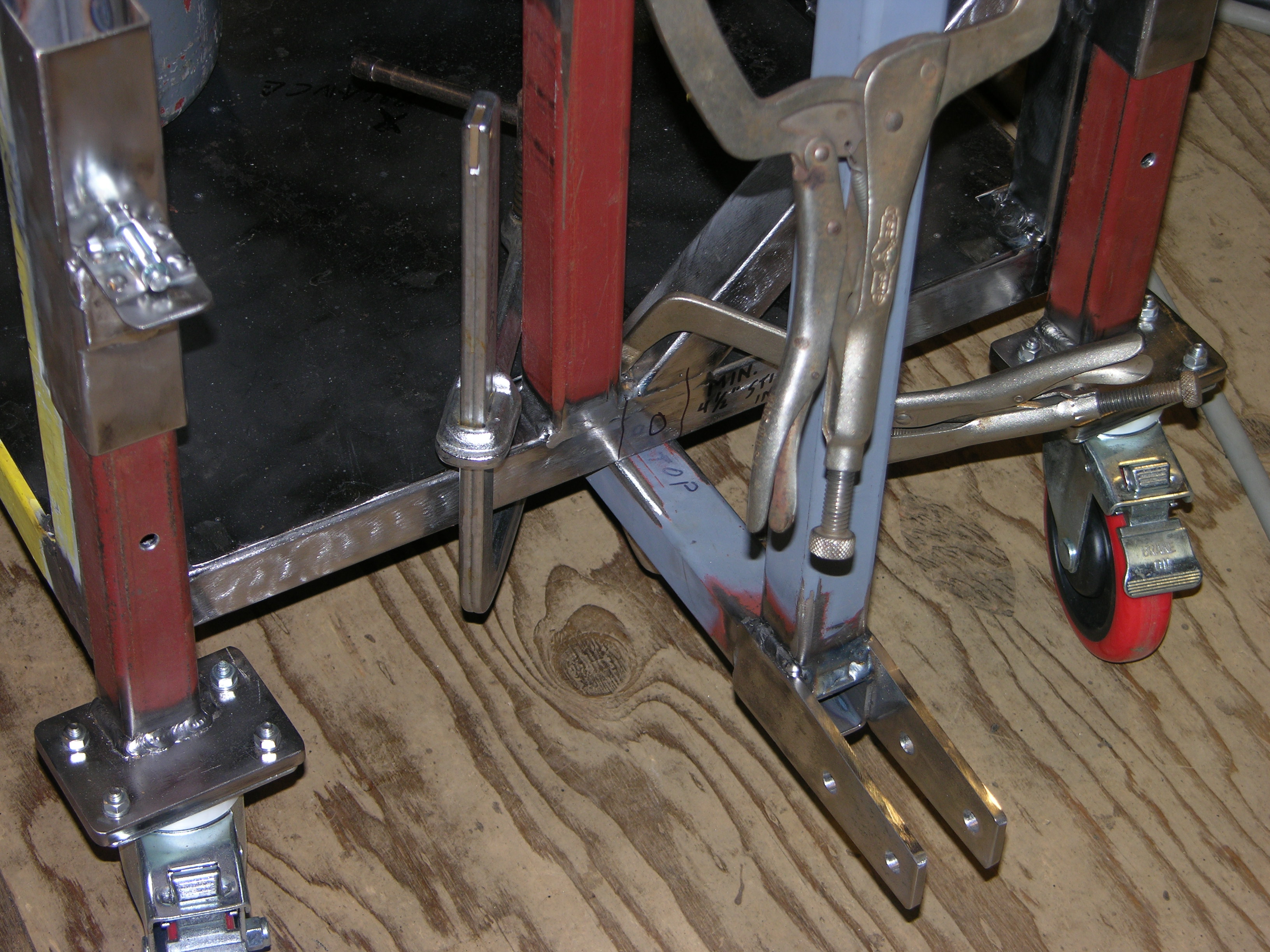 Wheels on (for now), caster sockets welded on, tank still fits (yay), welder side door clears the 1" angle, even WITHOUT the EPDM on the rails - the addition of a "hand truck handle" on the front will ALSO act as a guard for the regulator - and since the tank is FIRMLY locked in place, that should work pretty good.