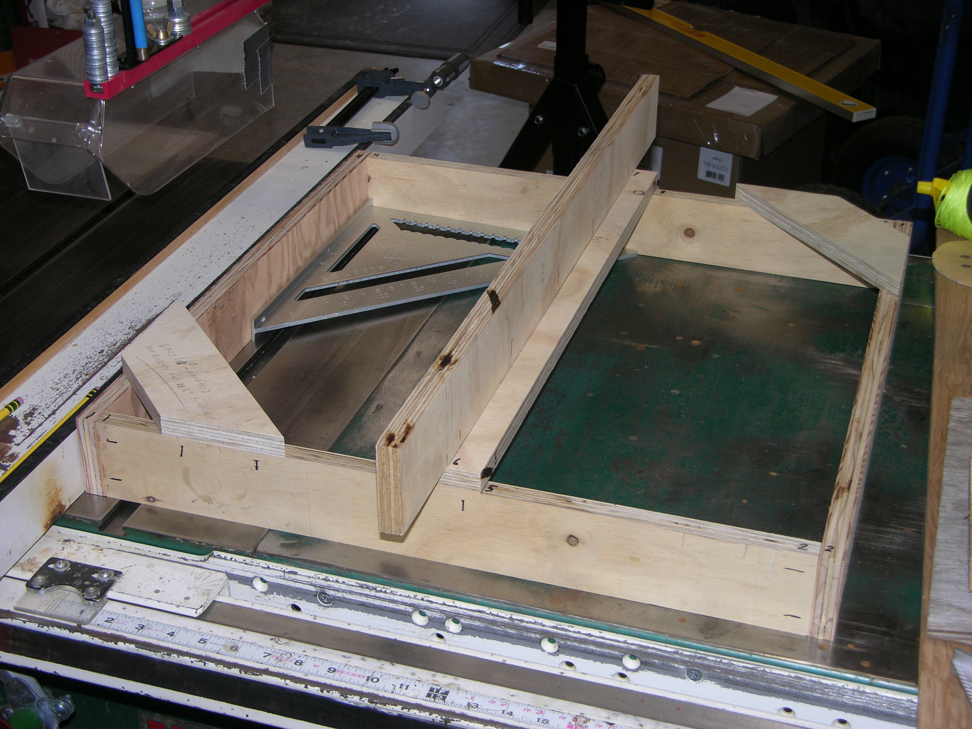 pic 1; I'm using a couple of the features of the 12" DeWalt, Makita and Bosch saws (maybe others) - one is the bevel, I hadn't needed that before. The other is the depth stop - this allows you to slide the saw but keep the blade at an adjustable height OFF the table, so you can do things like quickie dadoes, or (in this case) cut a 90* Vee in a piece of wood to make an outside corner clamping block. Also in that pic is a "bandaid", it's that blue groovy-lookin' thing