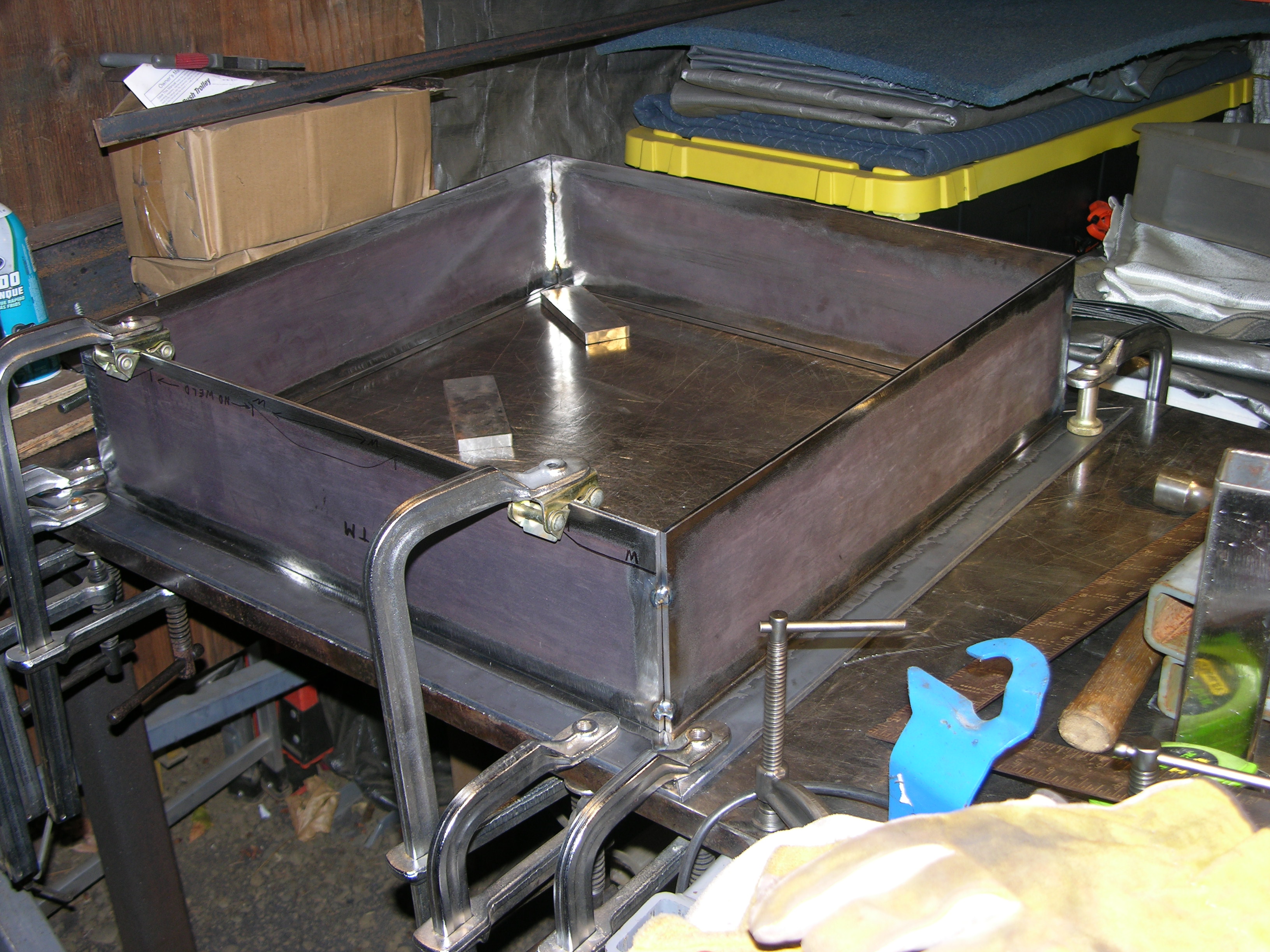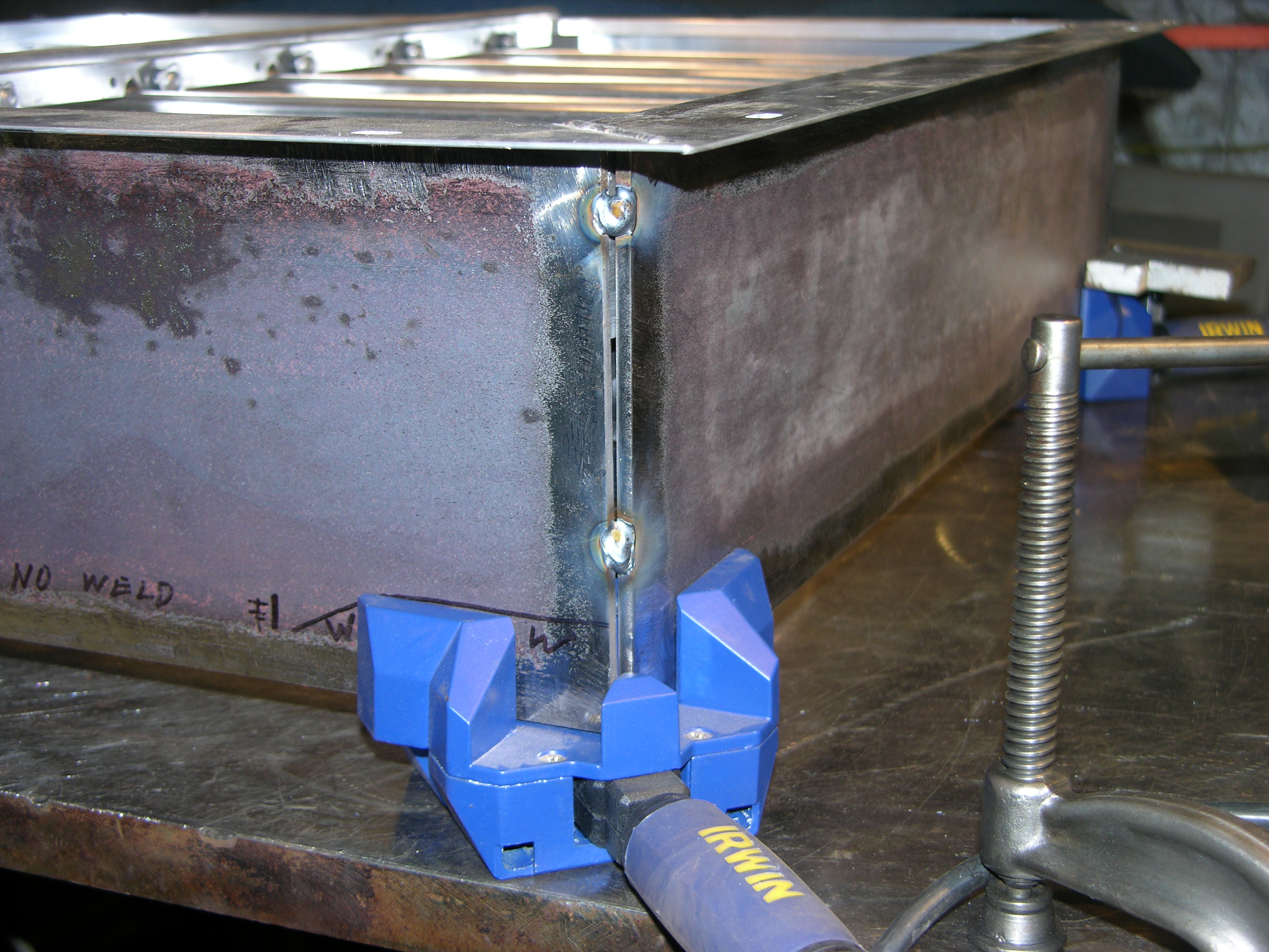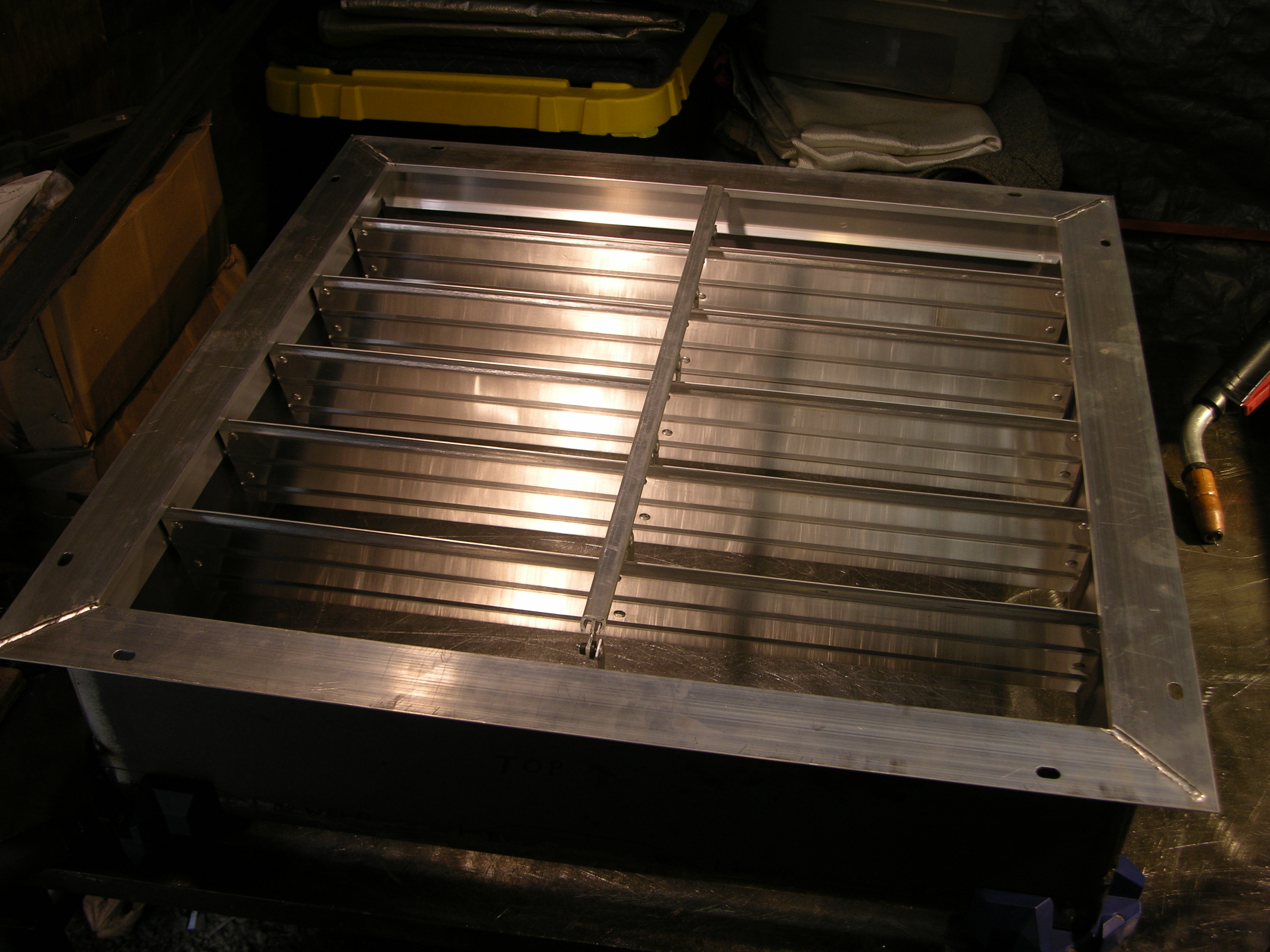 Got a little more done on the bigger louver insert today - a test fit after tacking the 3/16"x6" sides together; if it looks like the corner gap is a bit bigger at the top of the joint than at the bottom, it's 'cause it IS - when I was checking sizes, etc, I didn't notice that the pivot points for each louver stick out about 1/16" past the aluminum frame, so the part of the steel insert where the louvers mount needs to be just a little wider than the rest - too late to start over, so I just clamped the sides a bit further apart at the top before I tacked 'em -