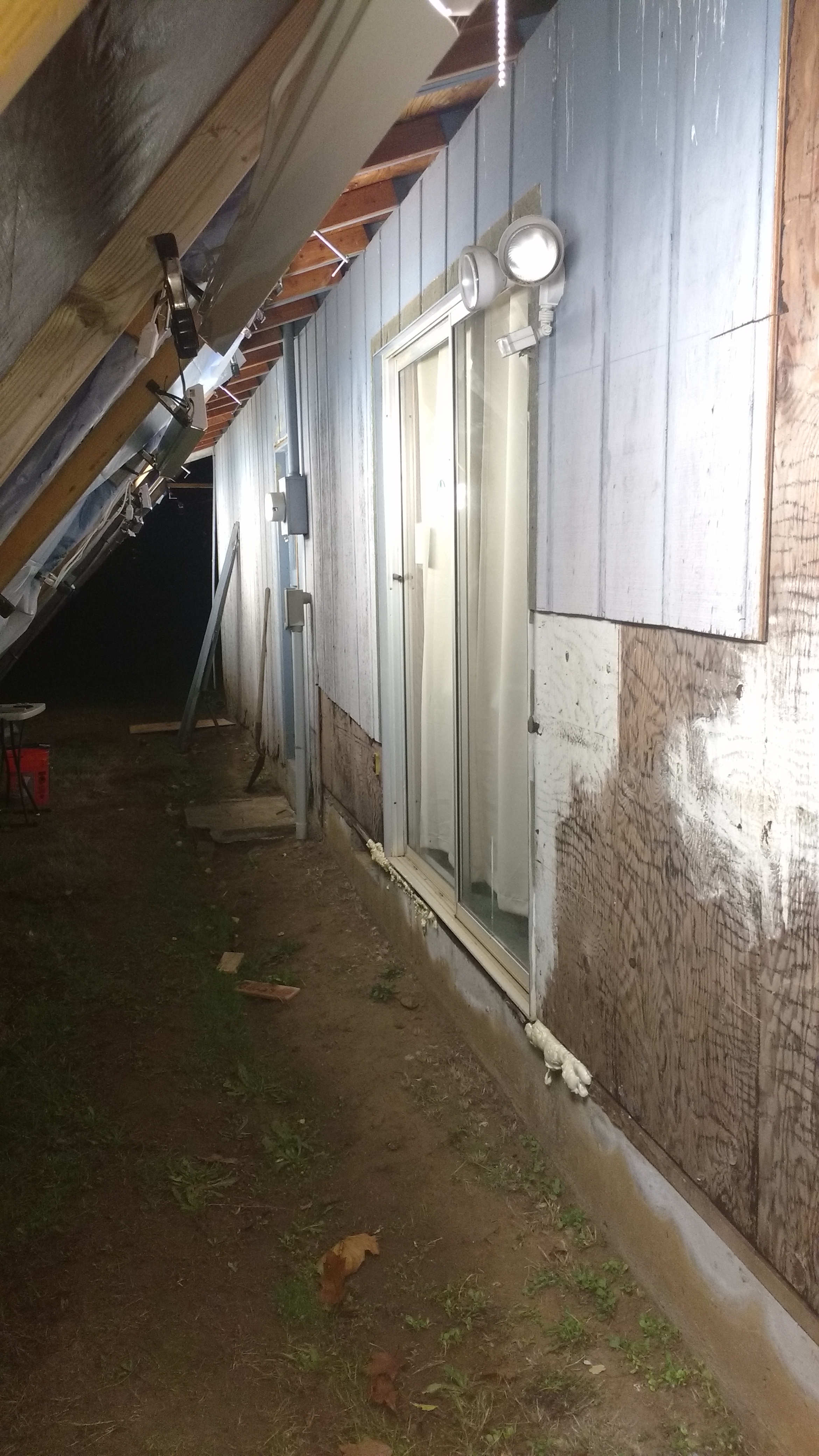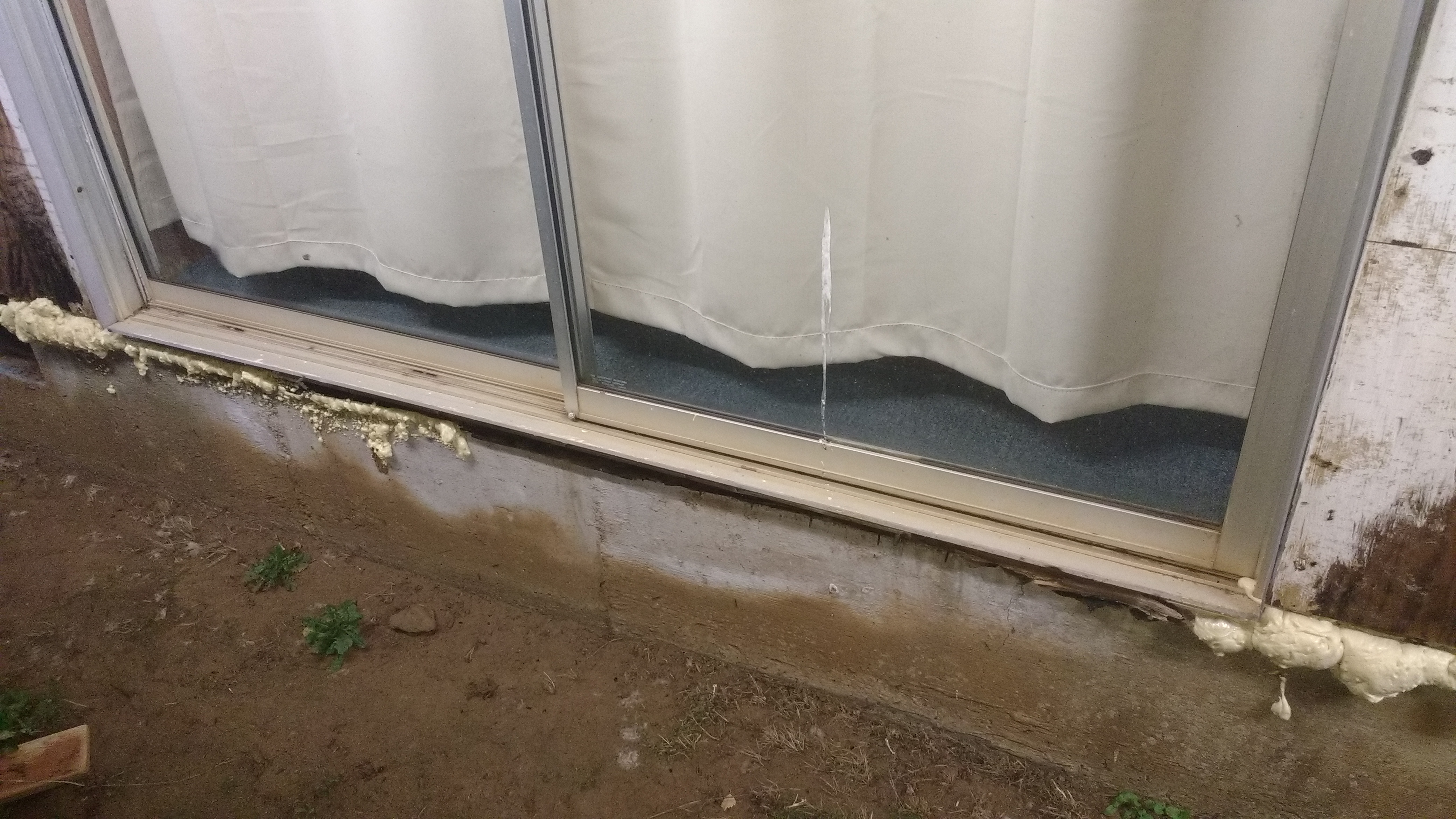South sliding door; foam is plugging up the completely GONE sill plate and some of subfloor - this is the "wait for spring" part, will likely require replacement of about 10' of sill plus up to 4 ft of subfloor and a few studs. Will get a new sliding door at that time. Will also require shoring up with double 2x12x12' temp header OUTBOARD - HousTentNite-4.jpg