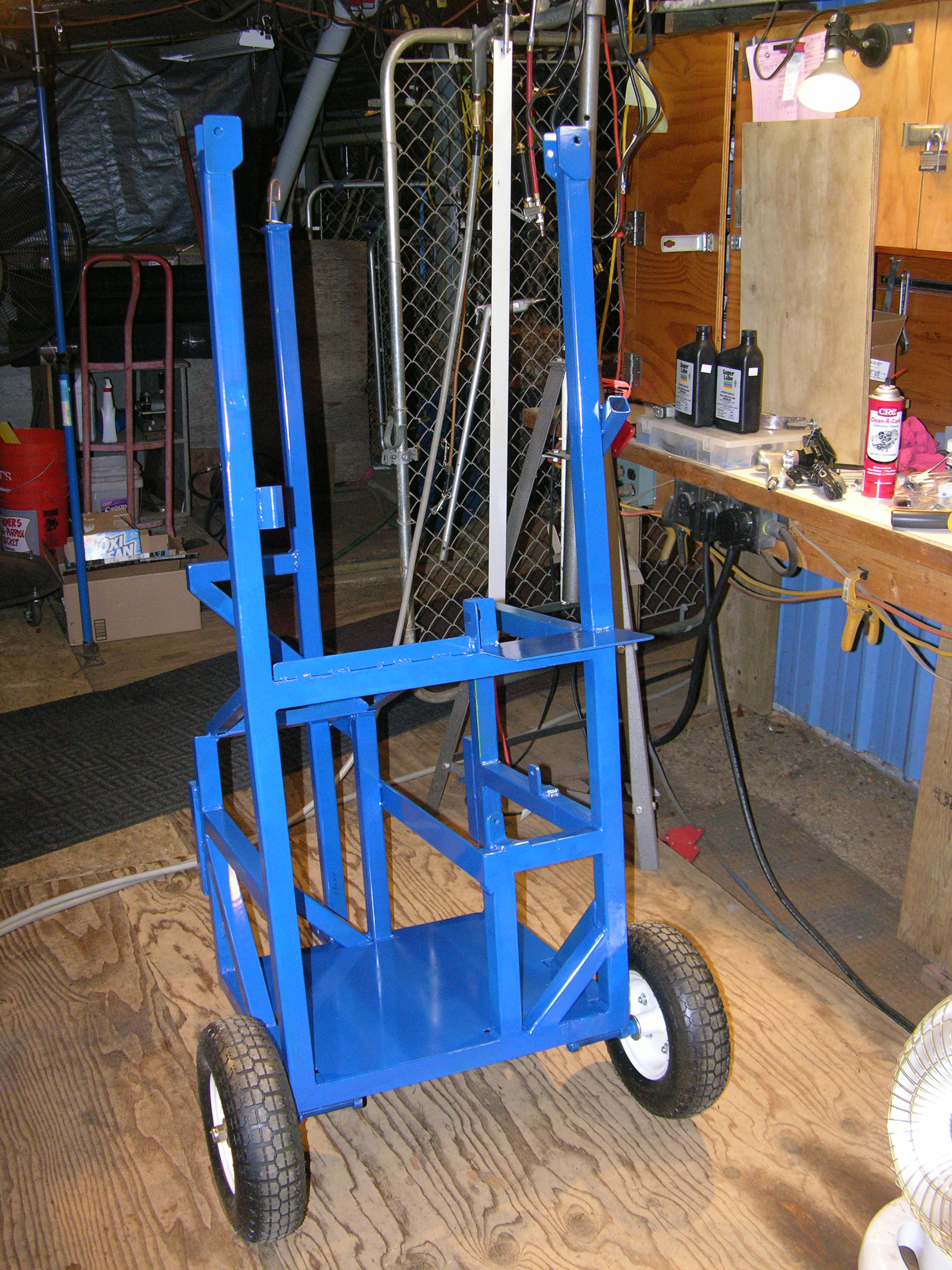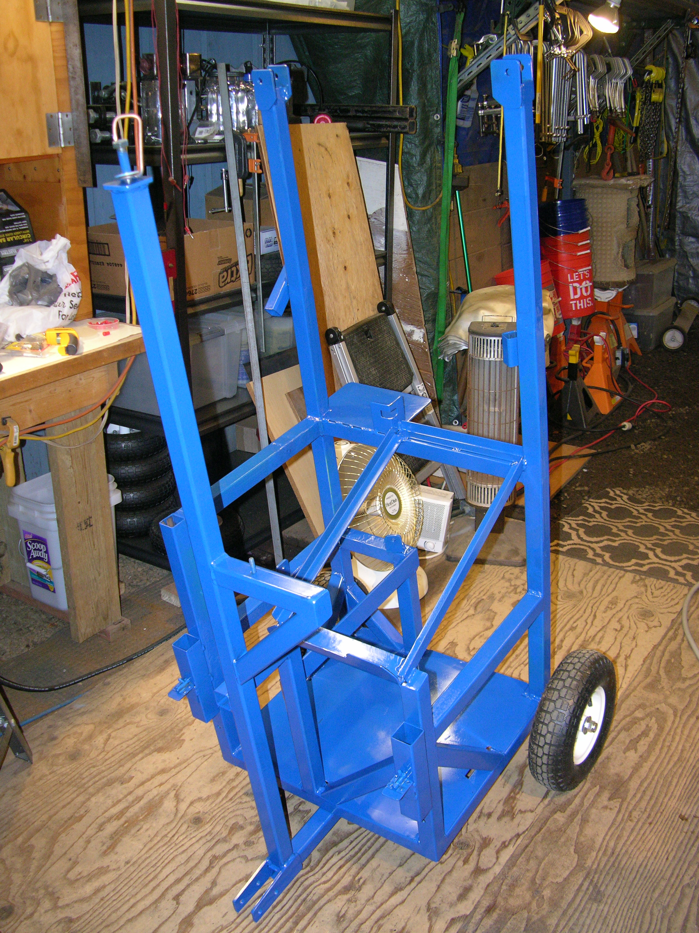 For heavier things (like the main frame on the "eternal weld cart") I can hang 'em from my "mini-jib" and use BOTH half-sheets for a lid, one on each side of the winch cable. If they're too tall for that, I have a 1 ton chain hoist hanging from one of the cross pieces in the "porta-shed" I built; 12'x12', roof is 9' to 11' height, hoist is about 9' to the max lift point.