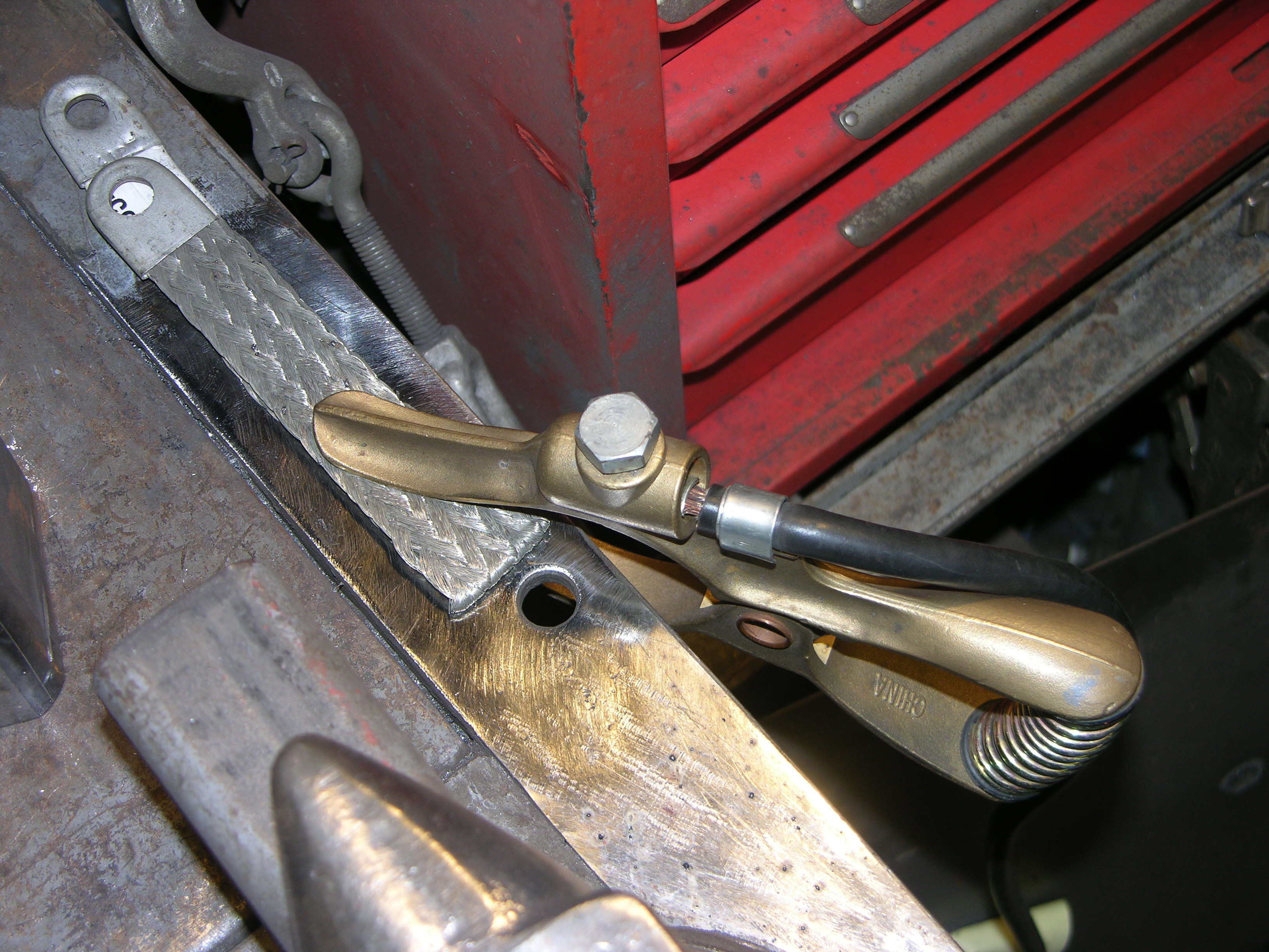 Thanks for the clamp tip but since Kris Kringle raise havoc with my credit card this past year I went with a $8.00 300 amp clamp for now, 400 seems like over kill for a small 211 Miller. The picture of how you use that braided cable came through a little blurry, might be due to a cranium on the brainium which can lead to a hocus pocus out of focus picture.