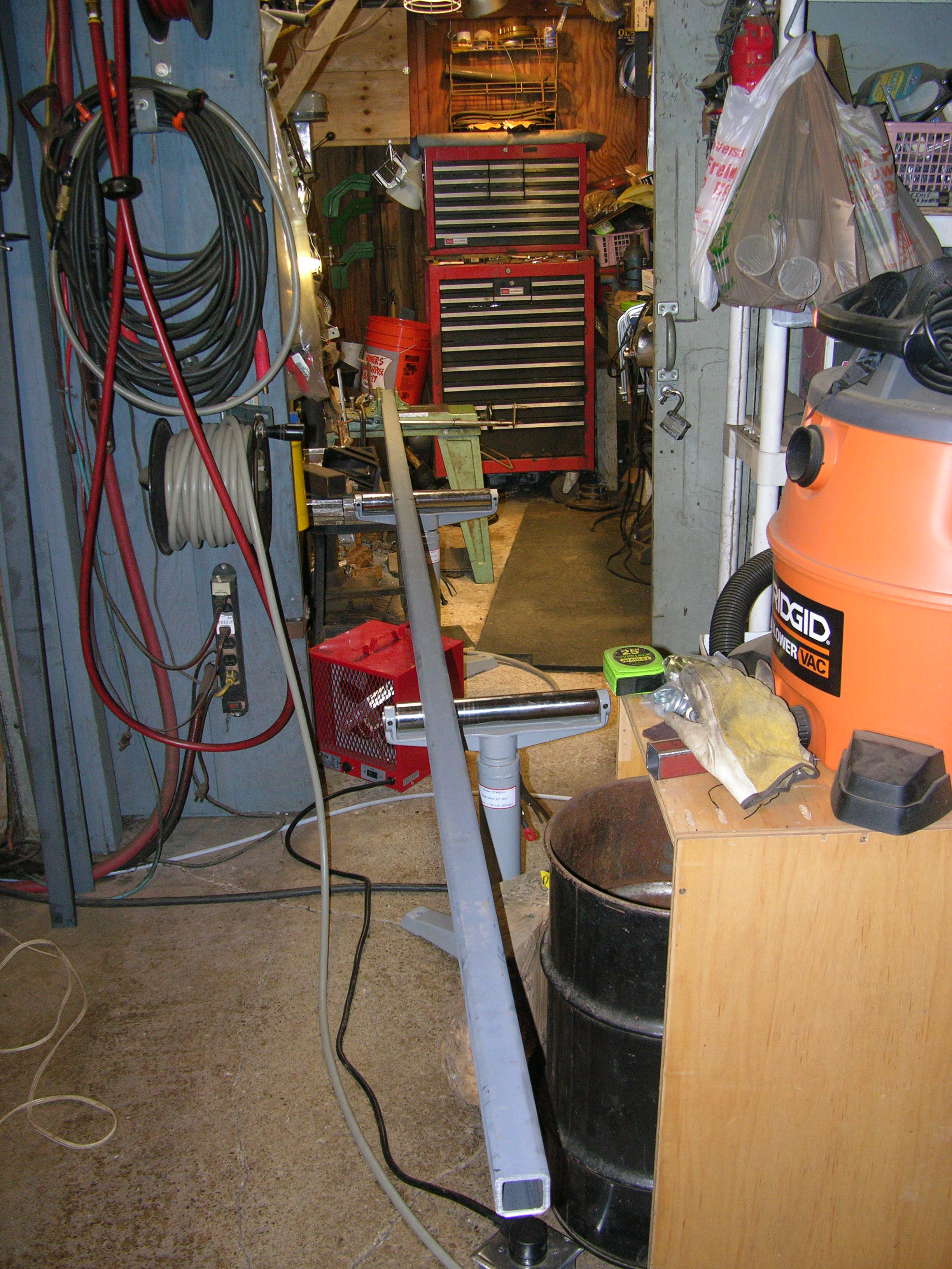 First, looking into the 8'x10' "phone booth shop" where I do most of the fab work (unless it won't fit :rolleyes:) -
