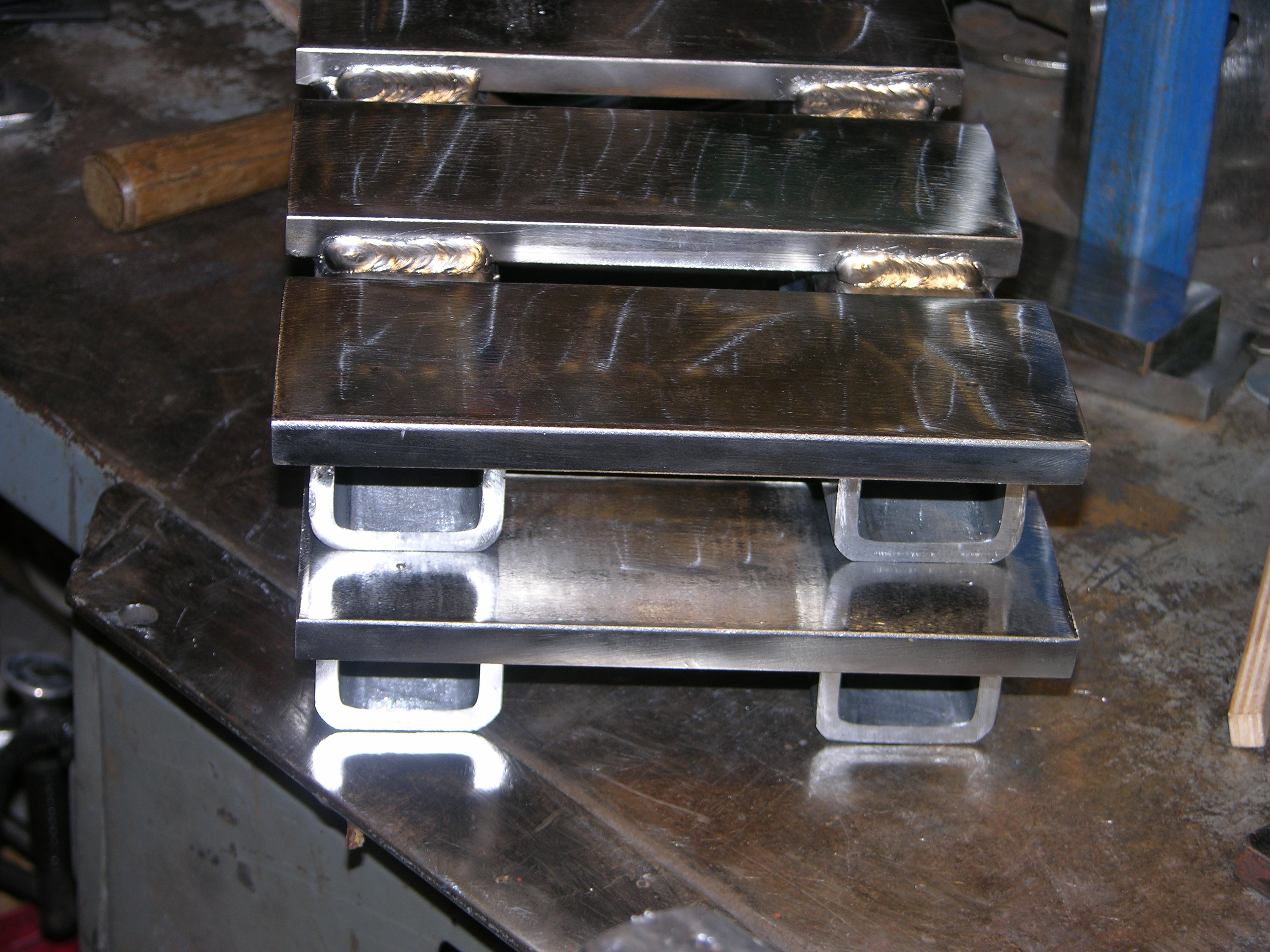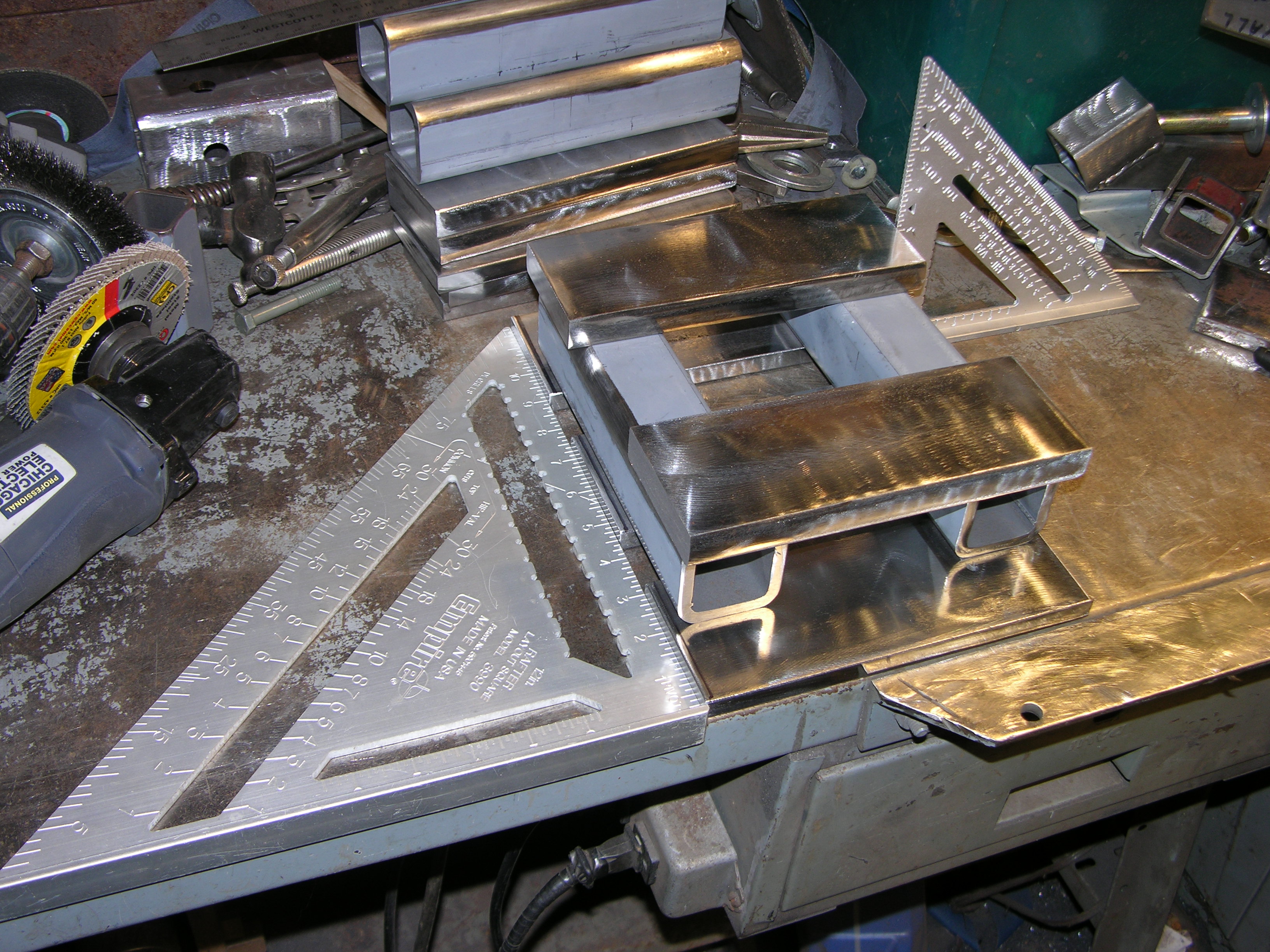 OK, little progress today - got the rest of the pieces de-scaled, insides of the tube ends shined up where nuts will be welded, layout of the 3 3" pieces of FB ('cause I don't have any 1/2 plate) laid out along with the 2 pieces of tube that'll be the "beam channel" -