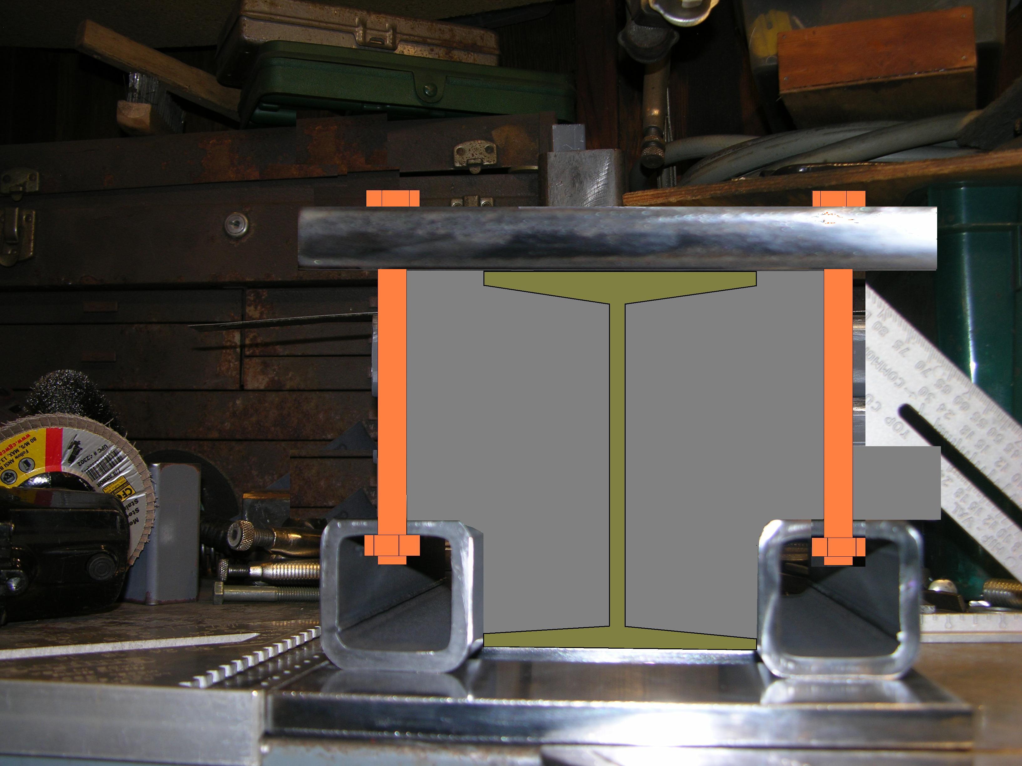 Layout - the 3 bottom pieces of 1/2" FB will get tacked to ONE of the 2" tubes, then that'll get clamped to the actual I beam with a 16 ga. "shim" between the tube and the beam (so it still fits after full weld) - then the SECOND tube will get clamped to the other ends of the 1/2" FB's, the whole assembly will get HARD clamped to the big weld table (1" thick, 3'x7') and won't get UN-clamped til everything's welded out and cooled - finally, mag drill will take care of holes thru the base that match the posts on the HF crane; also holes in both ends of both tubes for weld nuts to go inside - I did a little editing in Paint on the last one for clarity -