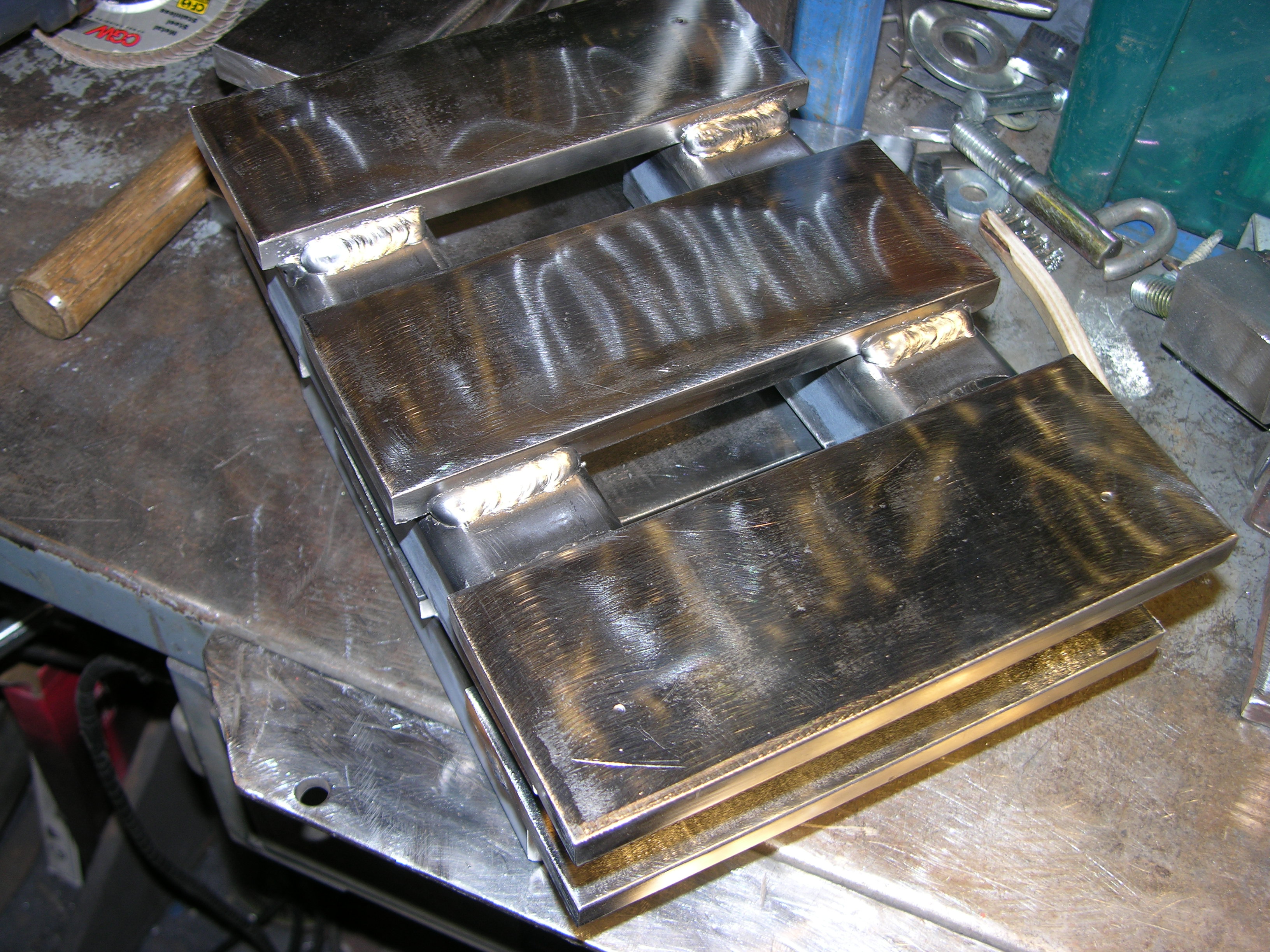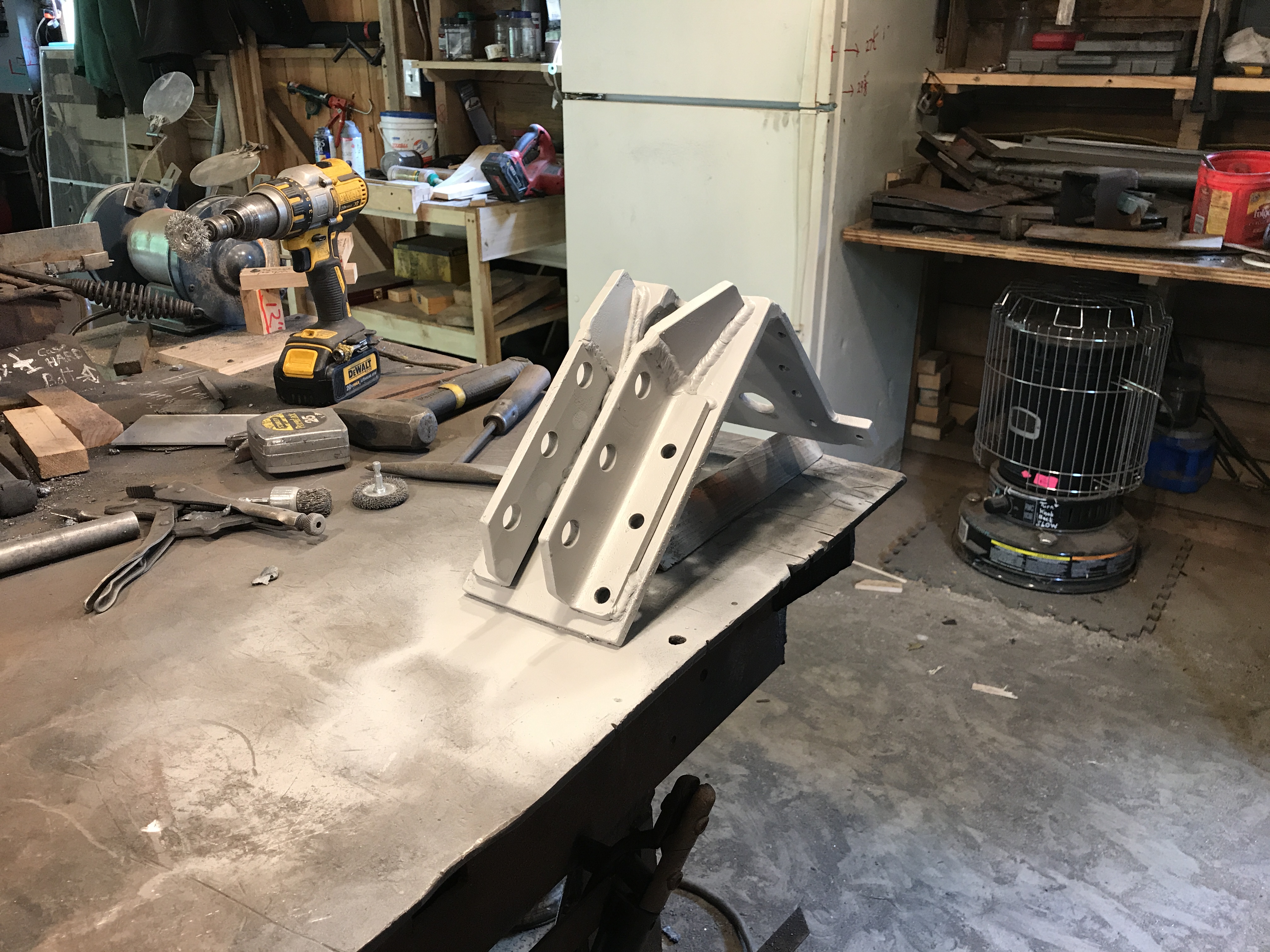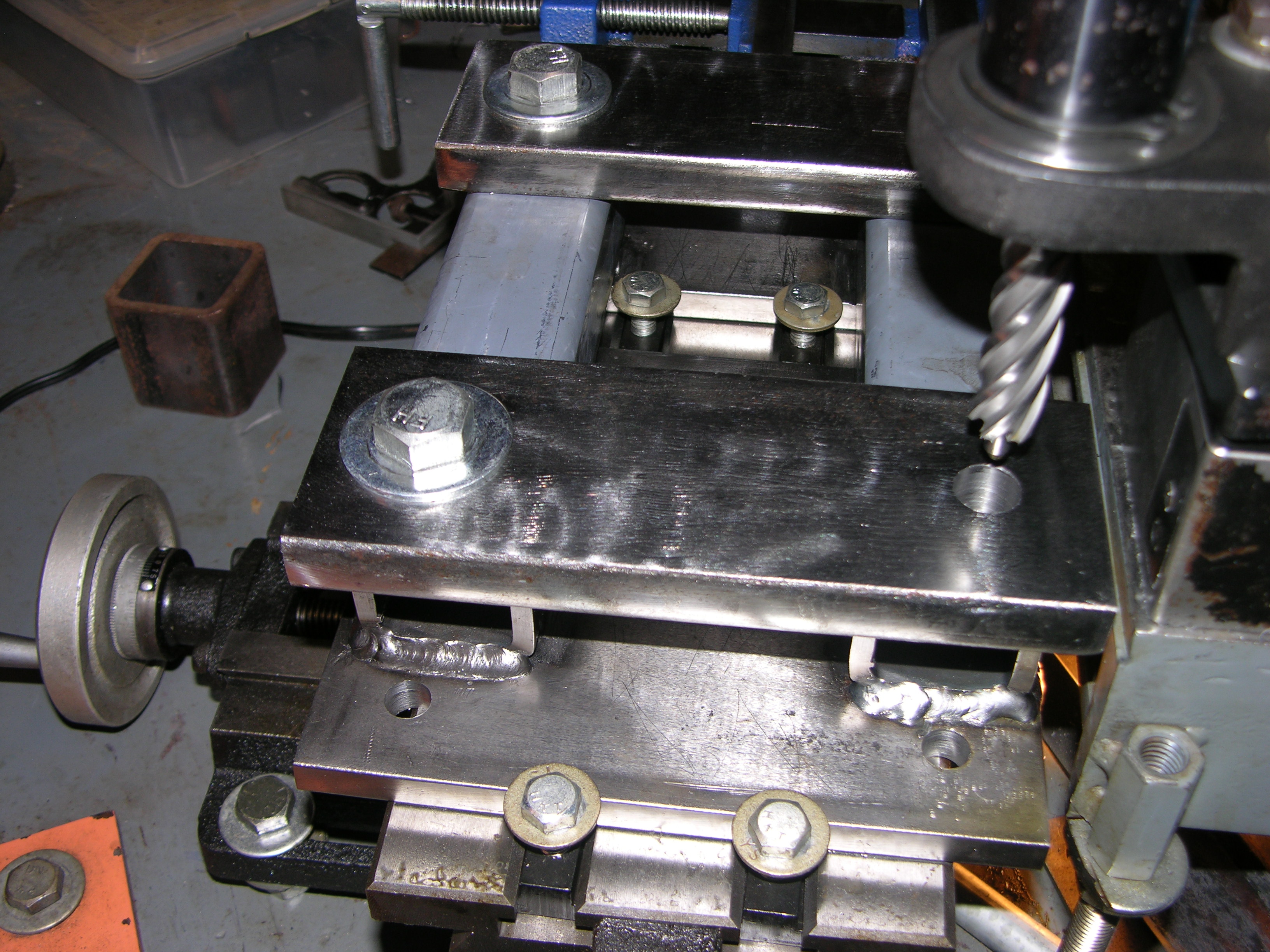 Oh, BTW I got a little more done on the HF crane mod - got all welded up EXCEPT for the nuts inside the square tube, need to drill for those FIRST - DID get hole locations punched - used the original I beam end plate for a guide, clamped to MY "sliding clamps", 1/2" transfer punch, 4 whacks per slider, done - DSCN3077.JPGDSCN3080.JPG - Sorry for hurtin' yer eyes with those "sloppy HUMAN welds :laughing: