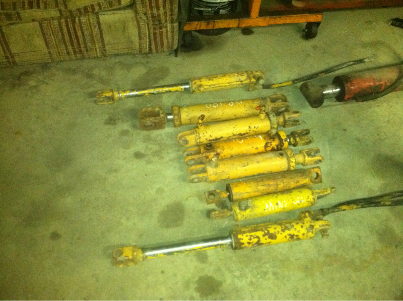 Some used rebuilt hyd cylinders off a trencher i took in on trade for some money a guy owes me i allowed him $100 for all the yellow ones. There is 3 matched that i hope to use 2 of for the mast tilt. I need get steel list made and get started on this again.
