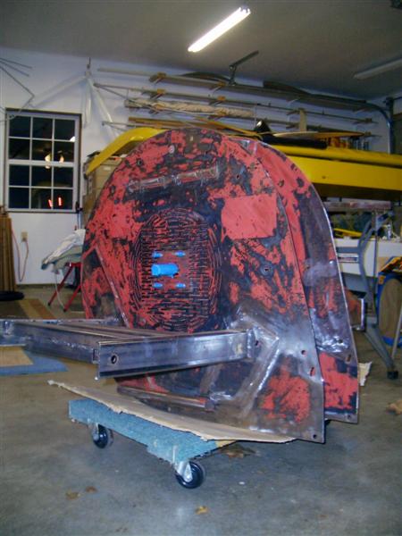 Disassembled the blower, scraped off about 20lbs of grease and gave everything a gas bath. Several hours later, man what a miserable job! Removing the old PTO adapter took a lot of heat. it was glued on with some kind of super epoxy. Cut off the un-necessary Toro Groundsmaster mounting apparatus and fixed a few cracks in the front and back housings. Used my last piiece of box channel left over from a trailer project to make the lower 3pt arms and drive shaft bearing mounts. Got the lower arm assembly stuck to the blower casing and prepped everything for some fresh paint. Felt like good progress today.