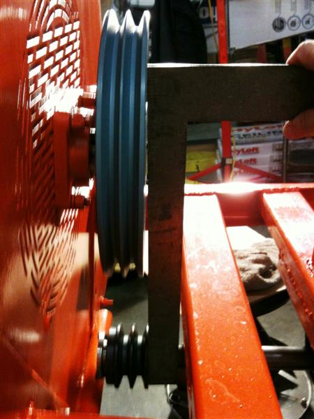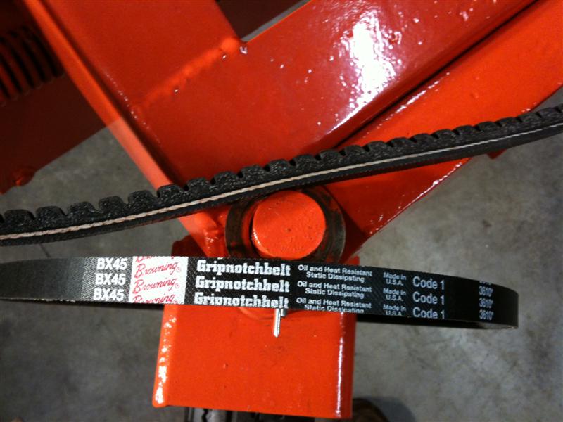 Issue #1- Blower was designed to run at 1850 rpm straight off the Groundsmaster 72 front PTO shaft so I'll need to make a speed increaser. I'm leaning towards pulley and belts vs. sprocket and chain. If no arguments to the contrary, what size (width) single or dual belts would be appropriate for this application?