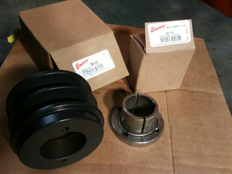 Picked up the sheaves, bushings and belts today. Decided to use 2-groove sheaves, a Browning 2BK32H 3.35" o.d. for the jackshaft and a 12.75" o.d. Maska import for the fan shaft. Besides being w-a-y less expensive than the Browning 2BK130H, the Maska has a reversible hub bushing which I felt might come in handy for clearance issues. The hub bushing is also more substantial vs. the Browning type H bushing, and this was recommended specifically due to having to grab onto a shaft stub whose length was less than the bushing thru-bore.