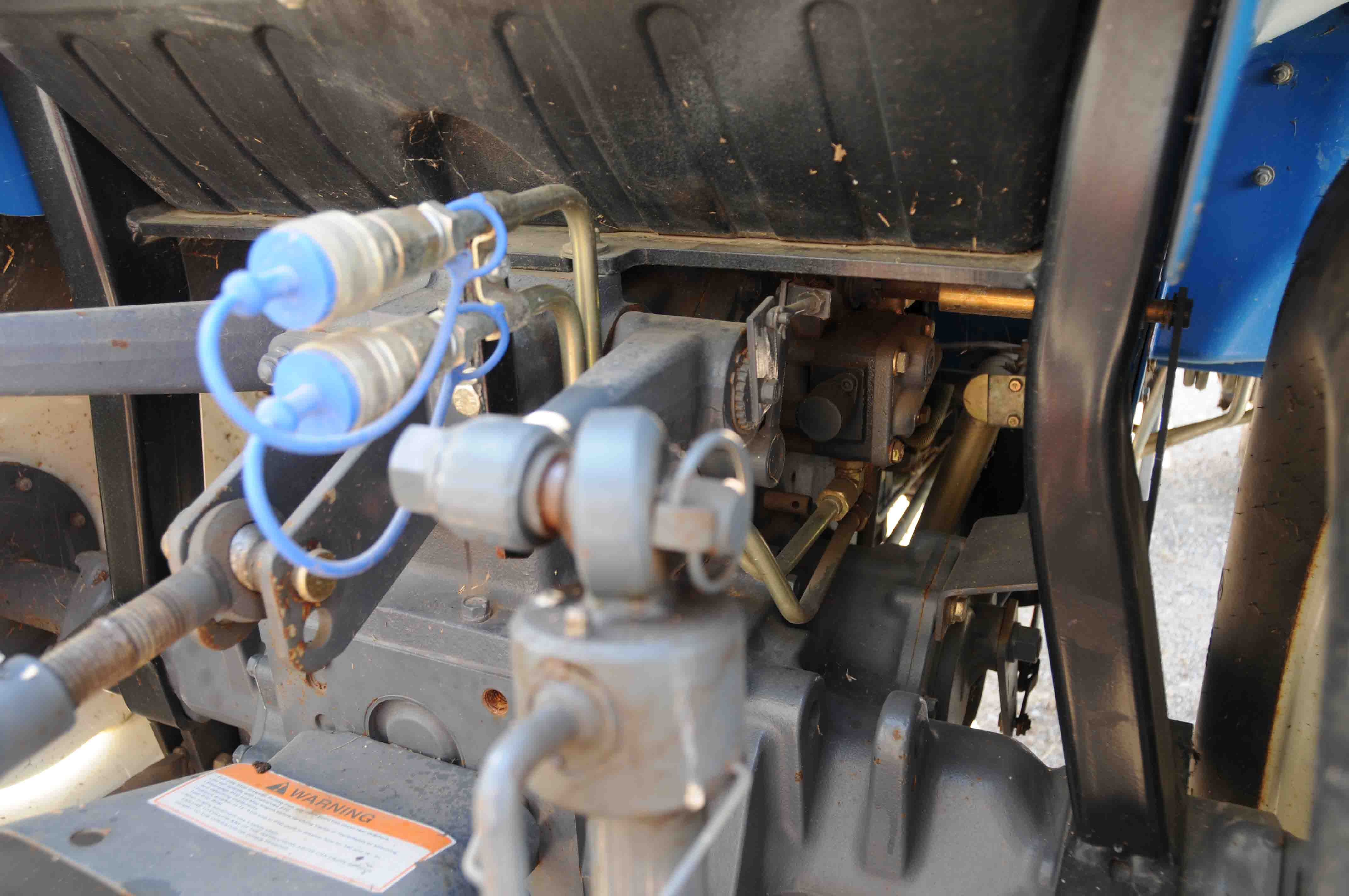 I found the photo I was looking for. It shows a much better view of the area around the remotes. Our remotes are located very close to the toplink adapter on the tractor and a side-mounted DPOCV would stick out in the way of the hose attachments on the right side. I suppose you could rotate it to the left side, but I think the arrangement in the photo is fine and assures the hoses are up and away from most obstructions. The rigid hydraulic tubing also makes a good place to loop the HTL hanger to hold it up when not needed.