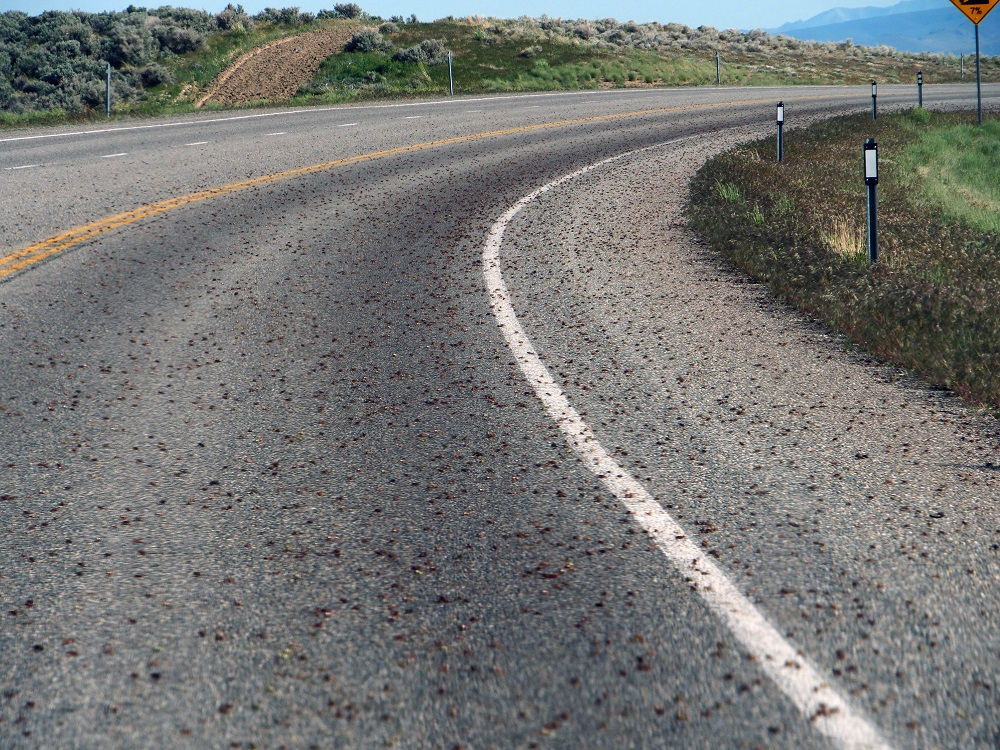 Deserteagle71 - you think that "gunk" on the road is bad for a normal vehicle. Try it on a motorcycle. First time I encountered this situation - my immediate thought was - earthquake. I was able to safely stop and examine. I motored on thru the swarm at about 5 mph.