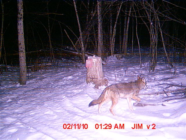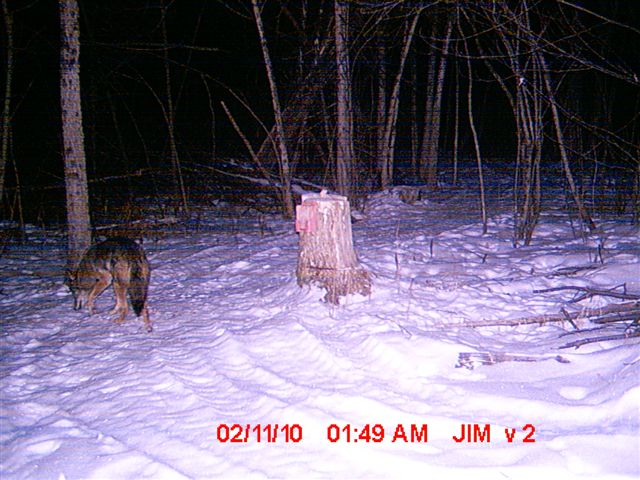 It's pretty funny actually, I had a large Muscovy duck die and it is frozen bullet solid. I set it on the stump to see if I could get a pic of coyotes or the cougar that is apparently around. So far all that I've got is coyotes and raccoons trying to eat this frozen solid duck with no success. Ha ha ha. It is a routine, each day I set it back on the stump and each night they drag it about 30 feet into the forest. When the weather gets warmer I will hopefully get rid of the darned duck.