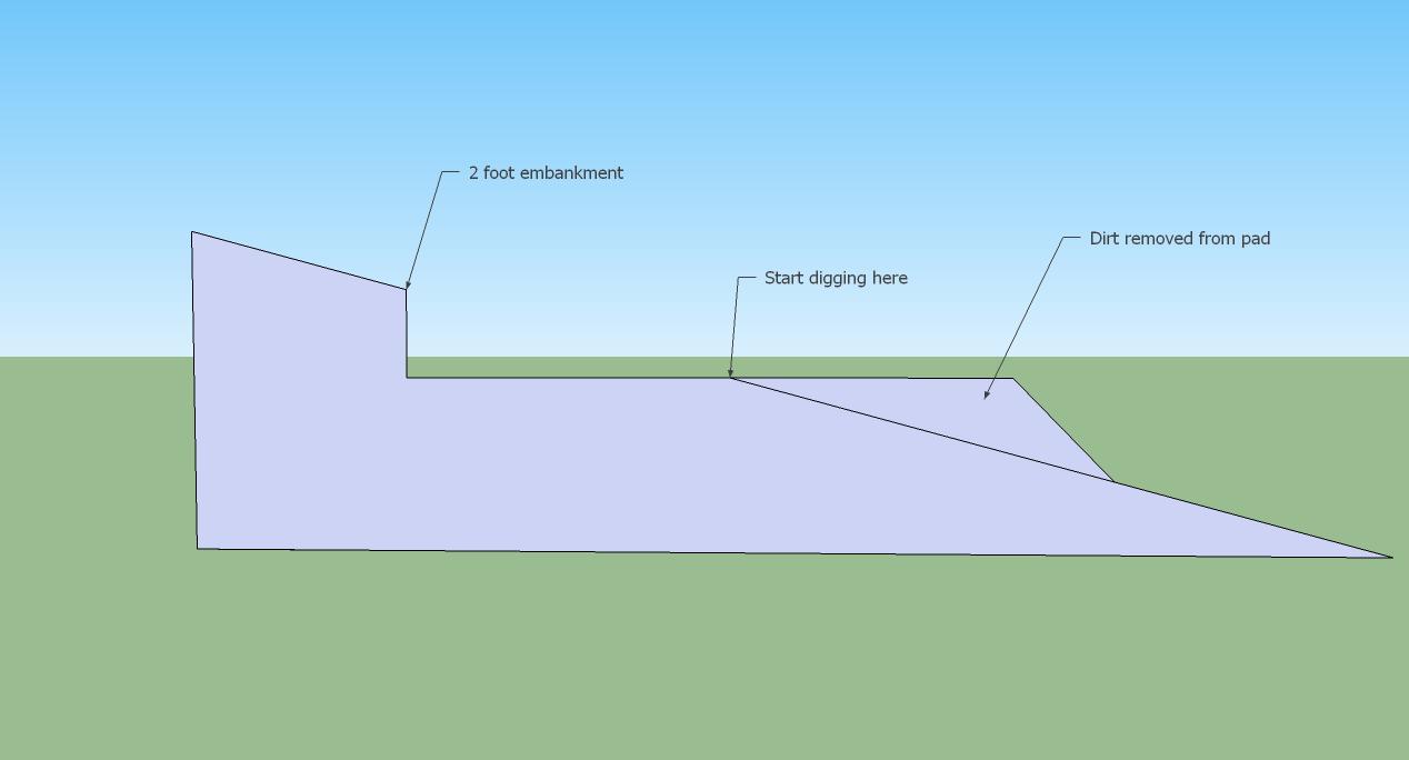Sorry for the confusion. What I meant to say is this-I have a road coming from another pad, so i started digging at the level of the road at which point was the front (downhill) side of the pad. As I got deeper into the hill, pushing the loose dirt out extending the front of the pad outward, the road ended up more toward the middle of the pad. So in short, I dug from the front until I got the size of pad I desired. I don't know if this helps or not.