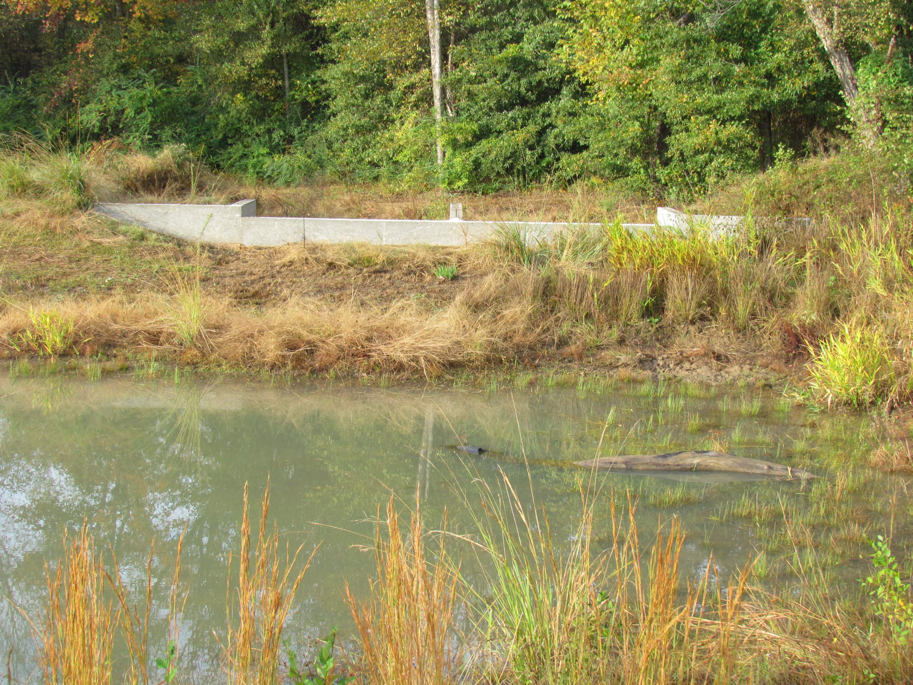 Nothing new to add to this other then that I was walking by the pond this morning and took a few pics of the concrete dam. I'm still three feet low from what used to be the full mark, and four feet low to overflow the new dam height.