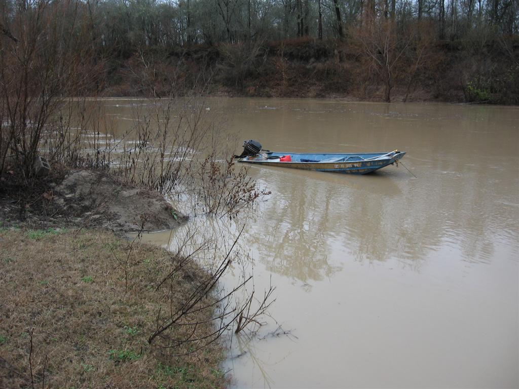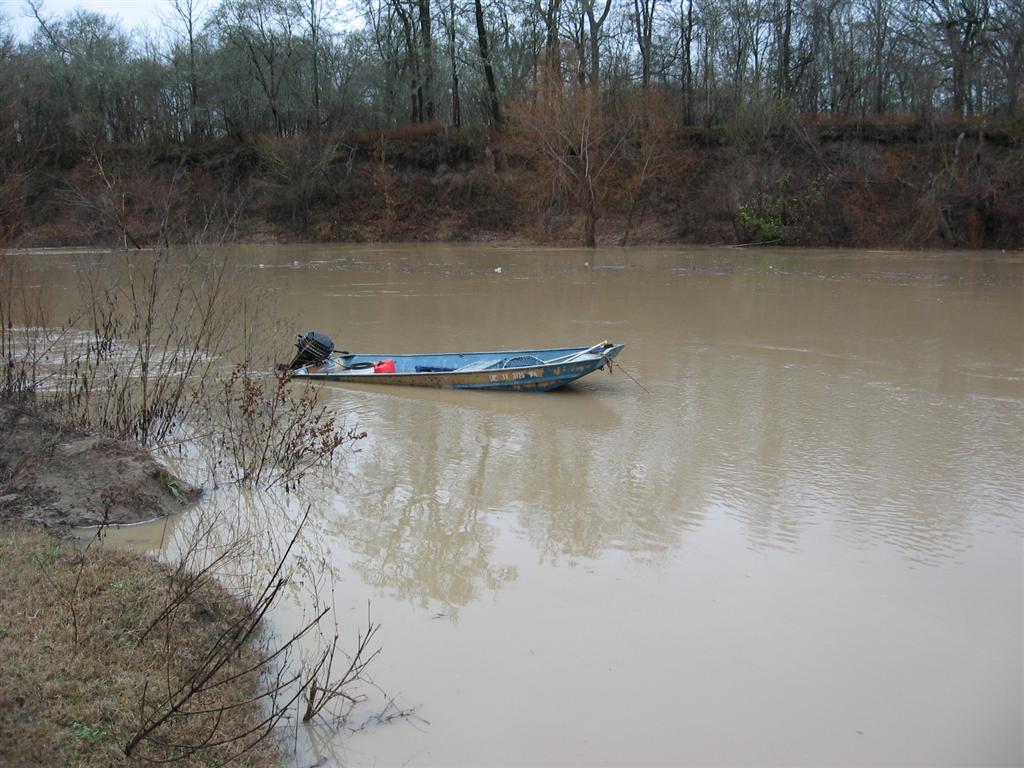 I'm surprised yall didn't get more rain. We are about 60 miles to the south and got plenty. Some tornados came through, took out power for about 5 hours. Blake and I had the boat in the river and almost lost it!! Attached are a few pics. This is in the Trinity river. I personally have never seen it come up this fast (we've built the weekend place in 2001). I wanted to go down and night and check it but my wife would have none of that. We left the boat, bait and some fish Friday morning at about 10:00am. Then the storms. I didn't think we got that much rain at the house, a neighbor recorded 2.5 inches...I think the boat got more. Saturday morning this is what we found. If you look at the line on the front, it's attached to a 3/8" piece of rebar in the shape of a J...stuck in the mud about 16". I don't know how it held. Also when we left the boat was half in the river and the J hook was about 12' in front of the boat. We were able to use a tie town with the hook end to hook the bait bucket, then pull it over. I held it up while blake got in (a little lighter than i :)) bailed it out. It didn't take much to get the hook out of the mud below. We are lucky to still have this boat. But after bailing, the engine never knew what happened...we fired it up and when fishing. We did lose 4 lines because we could not fing them... Somebody upstream got some rain!! It usually takes 3 days for the water from Dallas to reach this part of the river...