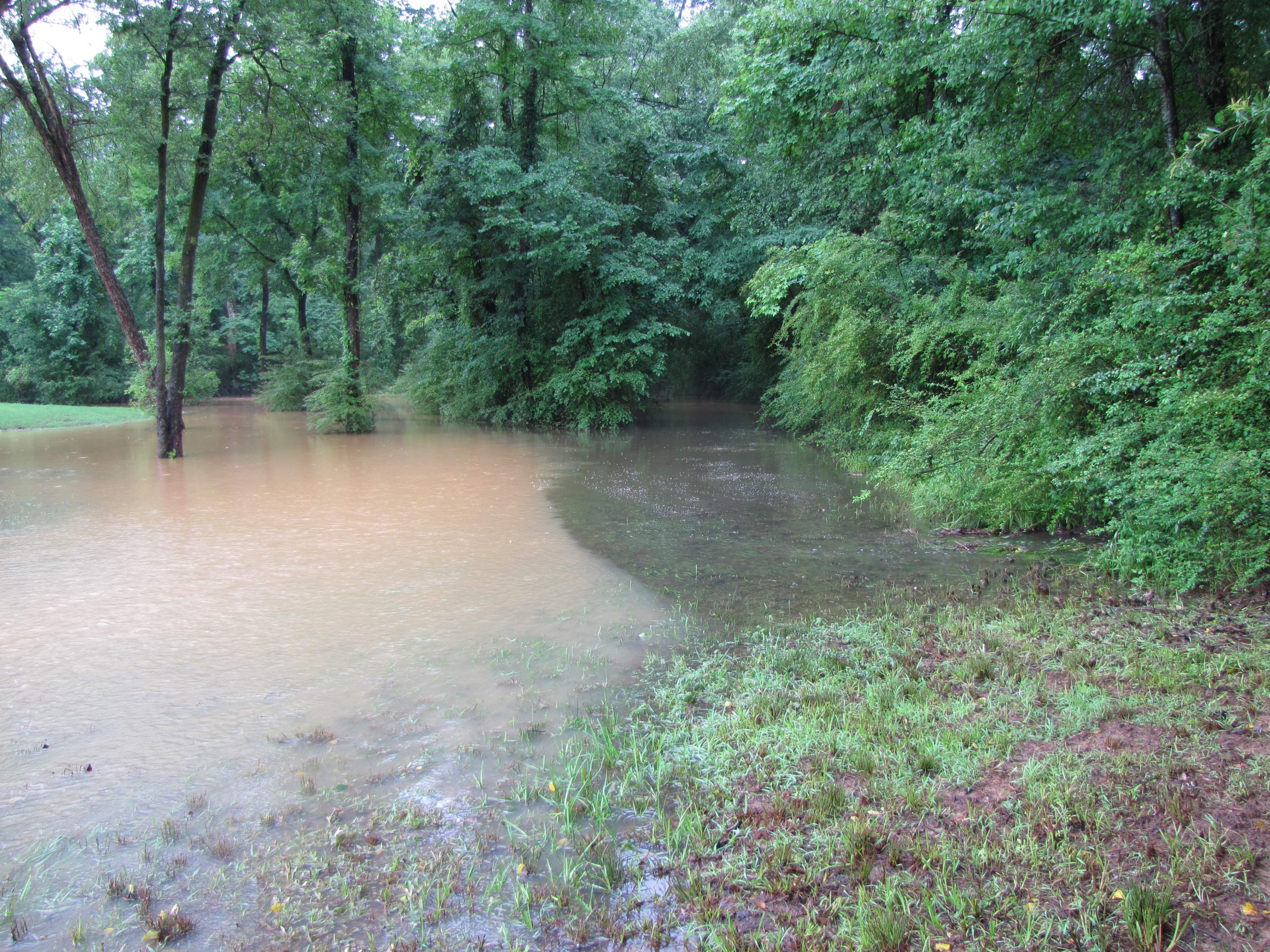 Wiggins Creek is my property line, and it's normally at the bottom of a four foot deep ditch. Twice before in the past five years I've seen it flood like this. This time, the water is at the same height, but seems to moving alot faster then I remember. I have enough grass on the dam to keep it safe, and the dam is so much bigger then it needs to be, that I'm not worried.