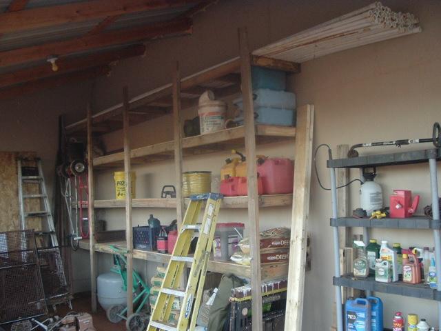 Once the pieces were cut, it's was pretty easy to put them together. I'm using ten foot 2x4's for the posts. That gives me an extra foot of height above the top shelf. The reason for that is it's where I plan to store all my PVC pipe. I have lots of it, but no place to keep it so it's out of the way, out of the weather, but readily accessable when I need it. Now I do.