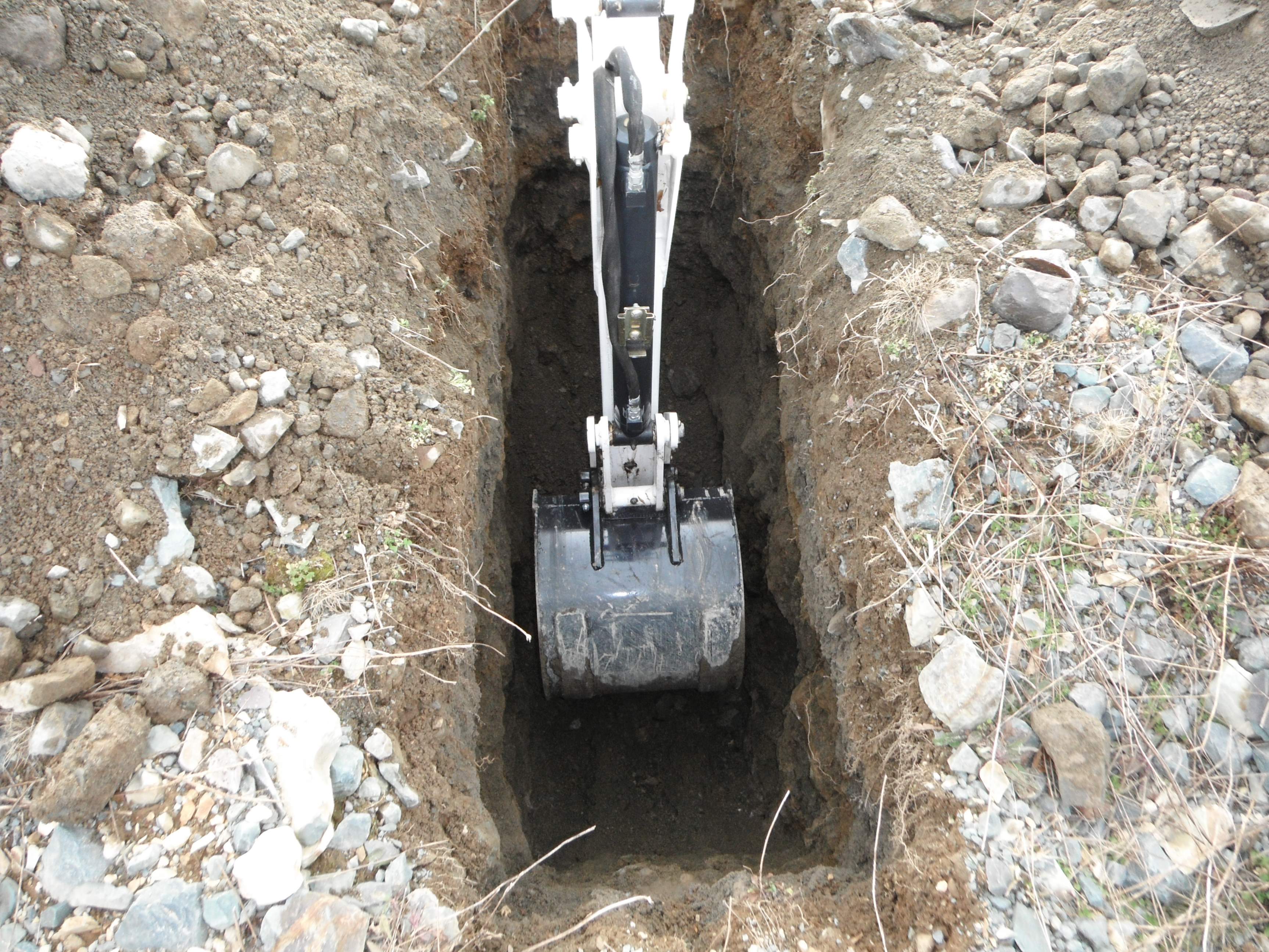 OK, I'll post a couple of pictures here. I practiced in a snow bank to get use to the controls but these pictures are from the first time digging in the ground. As you can see the gravel is very rocky. The backhoe had no problems digging with a 16" bucket.