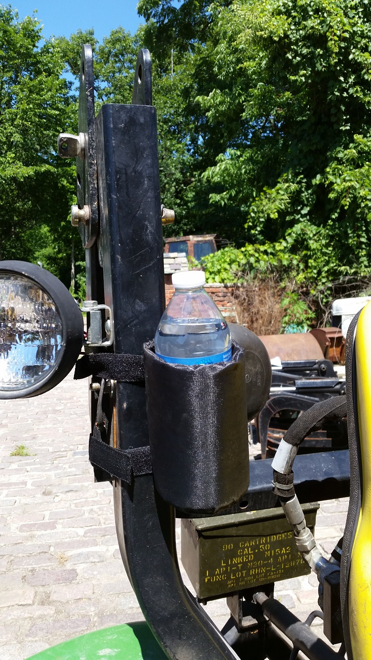 I bought these cup holders from Amazon for $6 for 2. Since one tractor I was leaving them on was going to be outside I used my cheap HF grommet kit and put a hole in the bottom for the rain to drain. Straps are long enough to go around the ROPS. Meant for a Jeep. They have handles too if you could find the use.