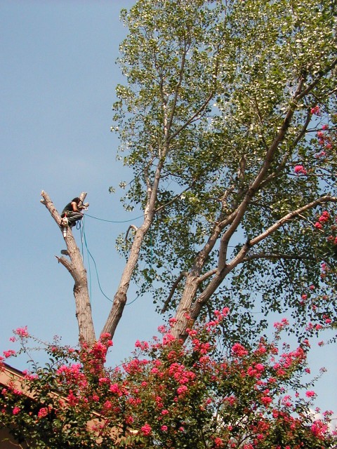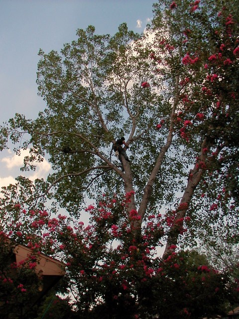 This is about a 60 foot tall cottonwood tree next door. A lot of big roots are above ground so there's some concern that it could fall on the house where a young couple with a 3 year old daughter and a 3 month old son live. There's also some concern that those huge roots might damage the house foundation and/or the sewer line from the house out to the street. And all that is in addition to the unbelievable amount of "cotton" that thing puts in the air and in our air-conditioners every Spring. So today it came down. A 4 man crew arrived before 9 a.m., but only one of them worked up in the tree and he was up there for over 9 hours with only 2 short breaks. Only one of the guys on the ground wore a hat and sunglasses. None of them used any of the safety items mentioned above; no hard hats, eye protection, gloves, hearing protection, or chaps. The guy in the tree did use a safety rope. See if you find him in the second picture. Incidentally, they had 4 or 5 Stihl chainsaws of different sizes.