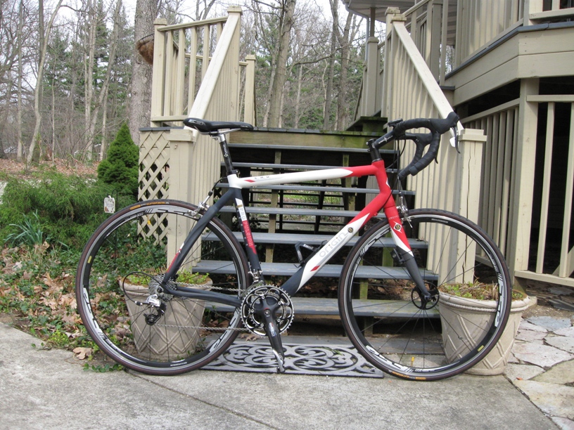 The upload seems to still be broken so I'll have to post the photos later. I have several road bikes but my best is one I built about 6 years ago. It's mostly carbon fiber. An Origin 8 full carbon frame with carbon cranks, seat post, wheel skewer levers, bottle cage, etc. SRAM Force shifters and FSA triple flange wheels. With pedals and relatively heavy Gator Skin tires, it still comes in under 17 pounds. I've done a lot of metric (62 mi) and full (100 mi) century rides on it.