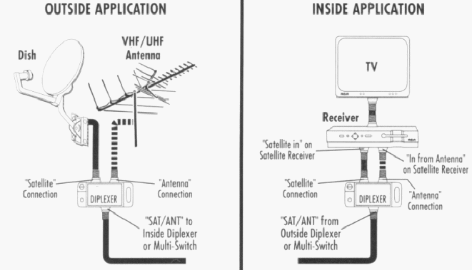 Also, if you're going to have a dish and an antenna, you can combine them onto one coax using a diplexer as in this diagram.