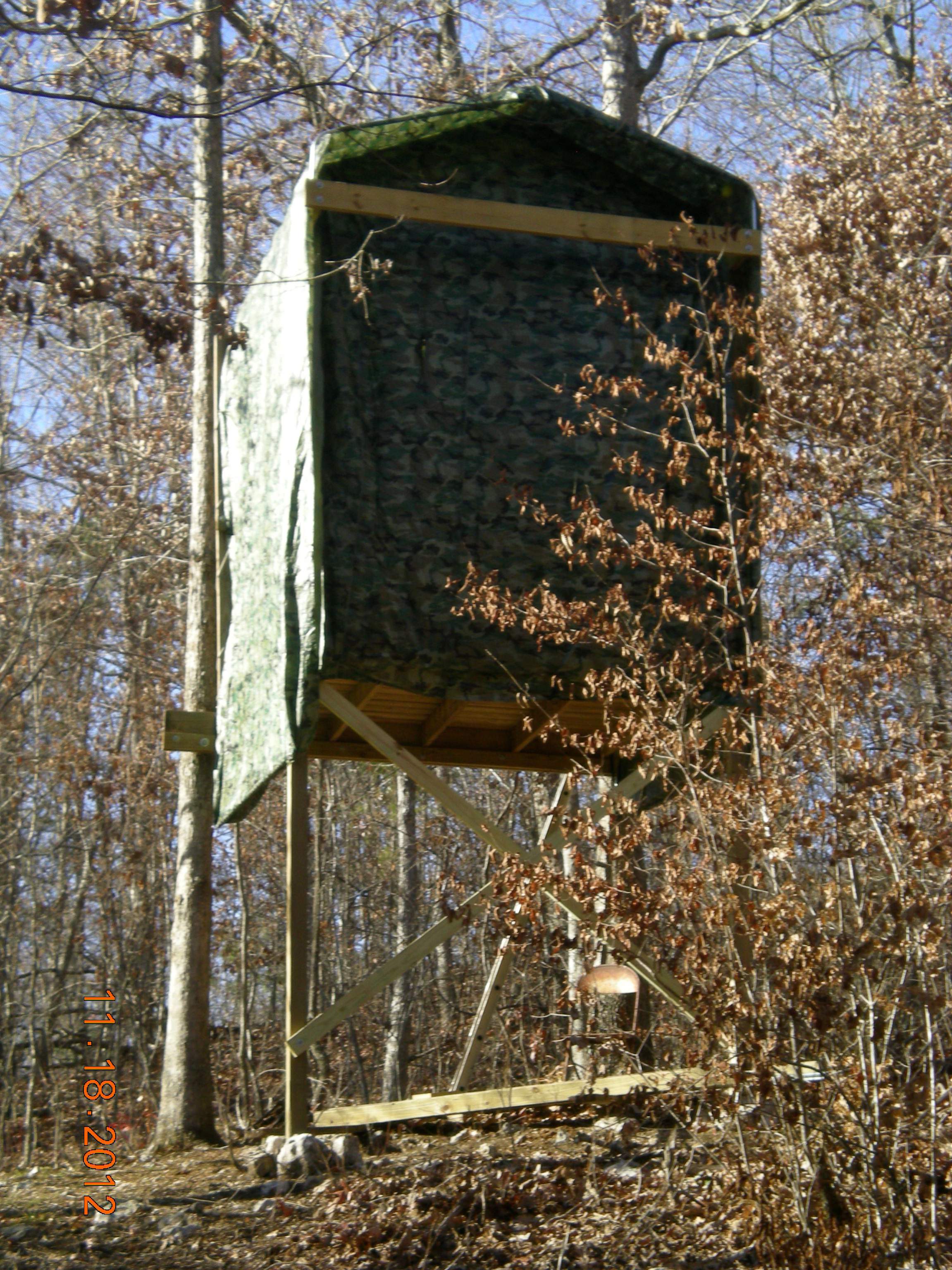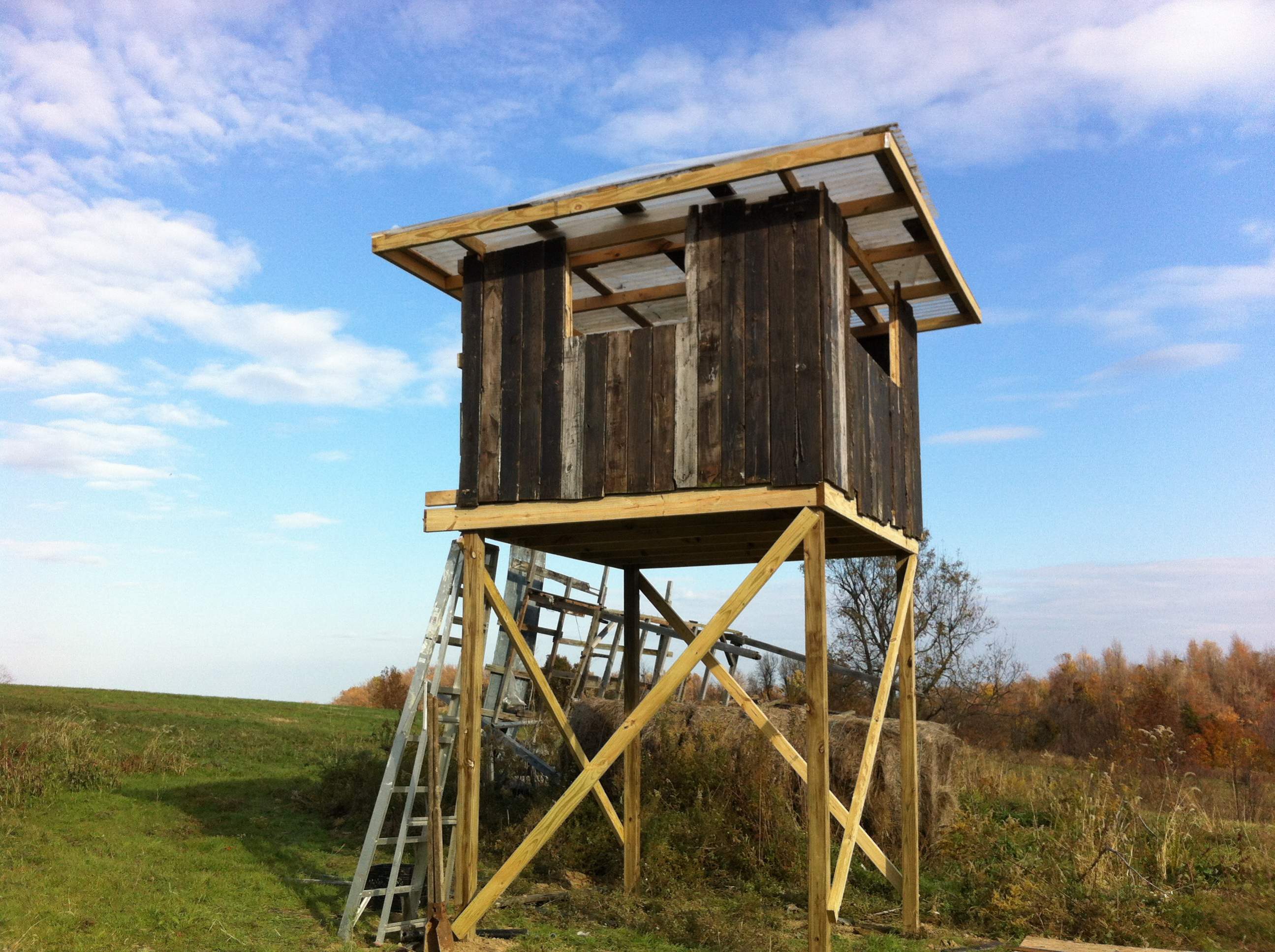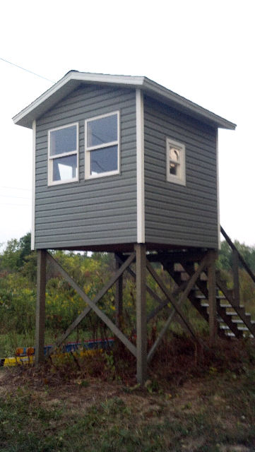 Most of our stands are simple ladder stands, or built into the tree with no walls or roof. But, we had some surplus scaffolding that we used to erect one about 15 years ago in southeastern Virginia. We built a sturdy floor, and wrapped the top in burlap. A hurricane blew it over years later so we rebuilt it 3 years ago. This time I anchored it, and used guide wires from each top corner since the floor is at 15'. We added walls and a roof (extra heighth to allow bowhunting) by building each section on the ground and hoisting them up - wasn't easy. These photos were taken before we added some camo to the walls. It has survived 3 major hurricanes since rebuilding it. Several "monsters" have been harvested.