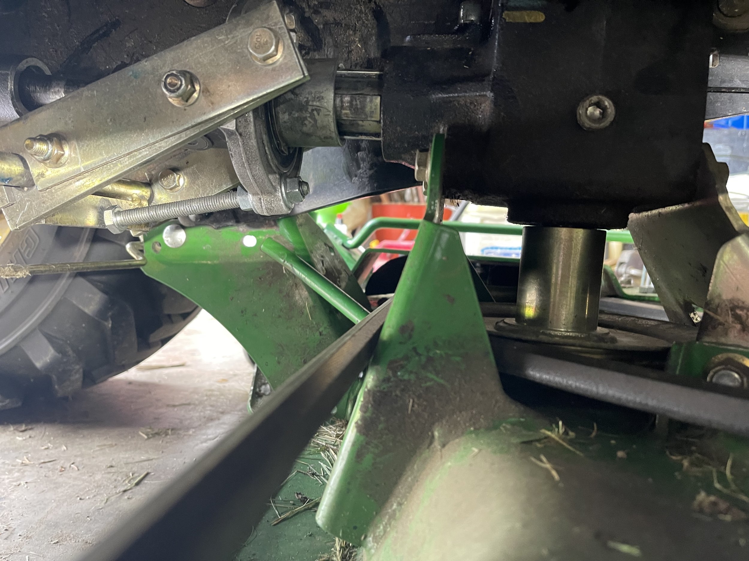 Replaced 2 u joints on pto shaft John Deere 1026 for 54d drive over deck . Can’t get shaft on mower deck to fully engage pto shaft. Deck needs to move 1 -2 inches rearward and is fully forward in front bracket. Any thoughts?