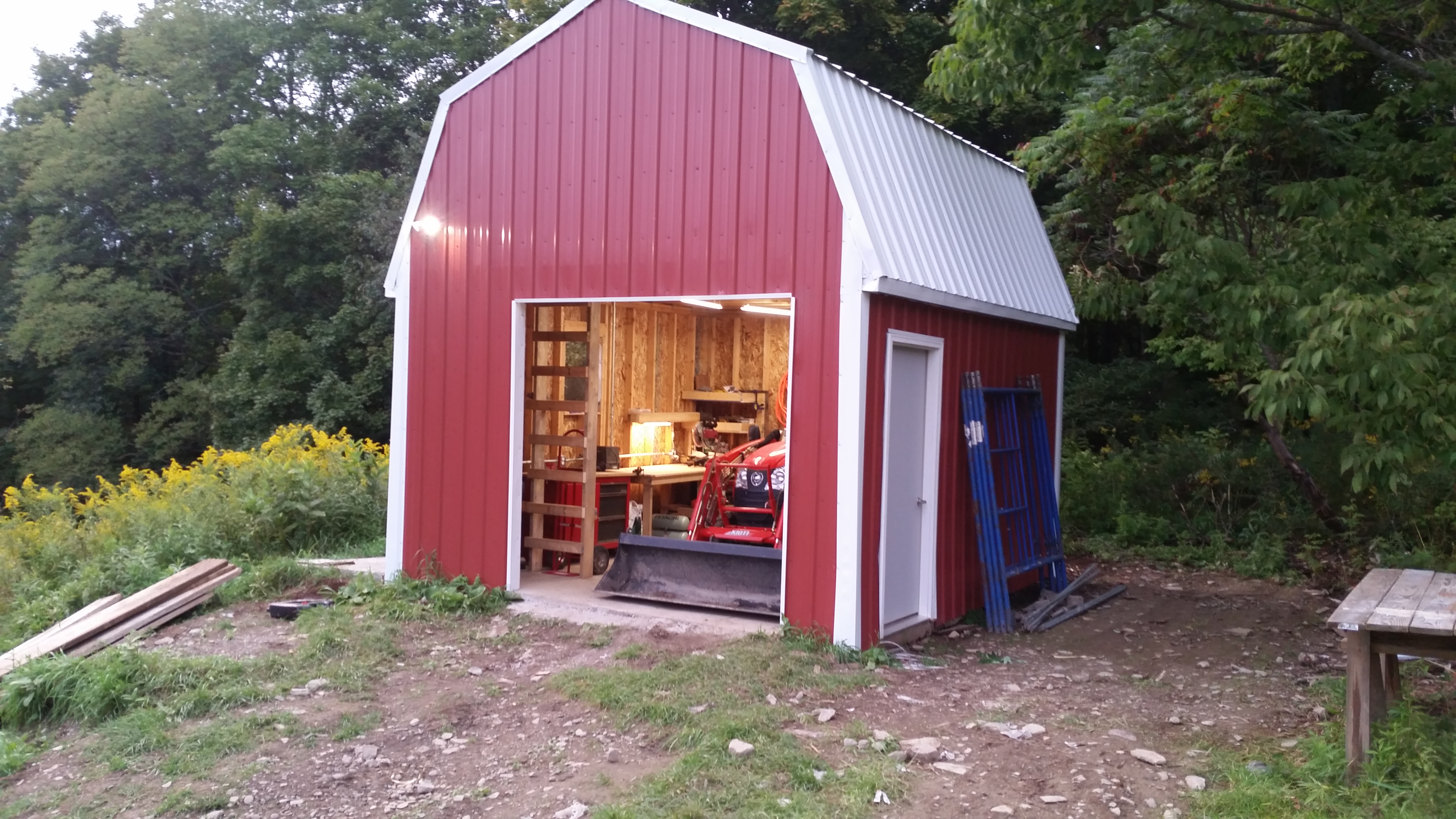 Currently, I am completing a 20' x 12' wood shop, and a 10' x 12' metal shop, under the loft in the new pole barn. I poured a concrete floor for those areas and for one of the 10' x 25' porches, but the rest of the floor in the new pole barn is crushed stone. I prefer that, because it is much cheaper and some of my old tractors leak a bit of oil here and there. Having that nice level concrete floor in the shop areas, and on the porch is really nice though. So far, my favorite things about the new barn is the leak-free roof, concrete floor and the LED lighting.