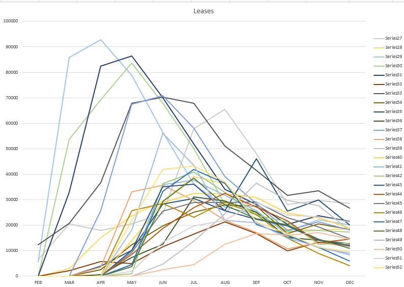 Then it will take a while to increase production even if the price per barrel reached the $89 range. New wells have to be drilled just to maintain daily production as a new well's production starts declining after the first 6-12 months. You get 50% of a well's lifetime production in the first 3 years of an average 30-year life span. Our experience bears that out. Here is a graph of production from 26 of our leases totaling 33 wells for the first year. Some leases have 2 wells comingled.