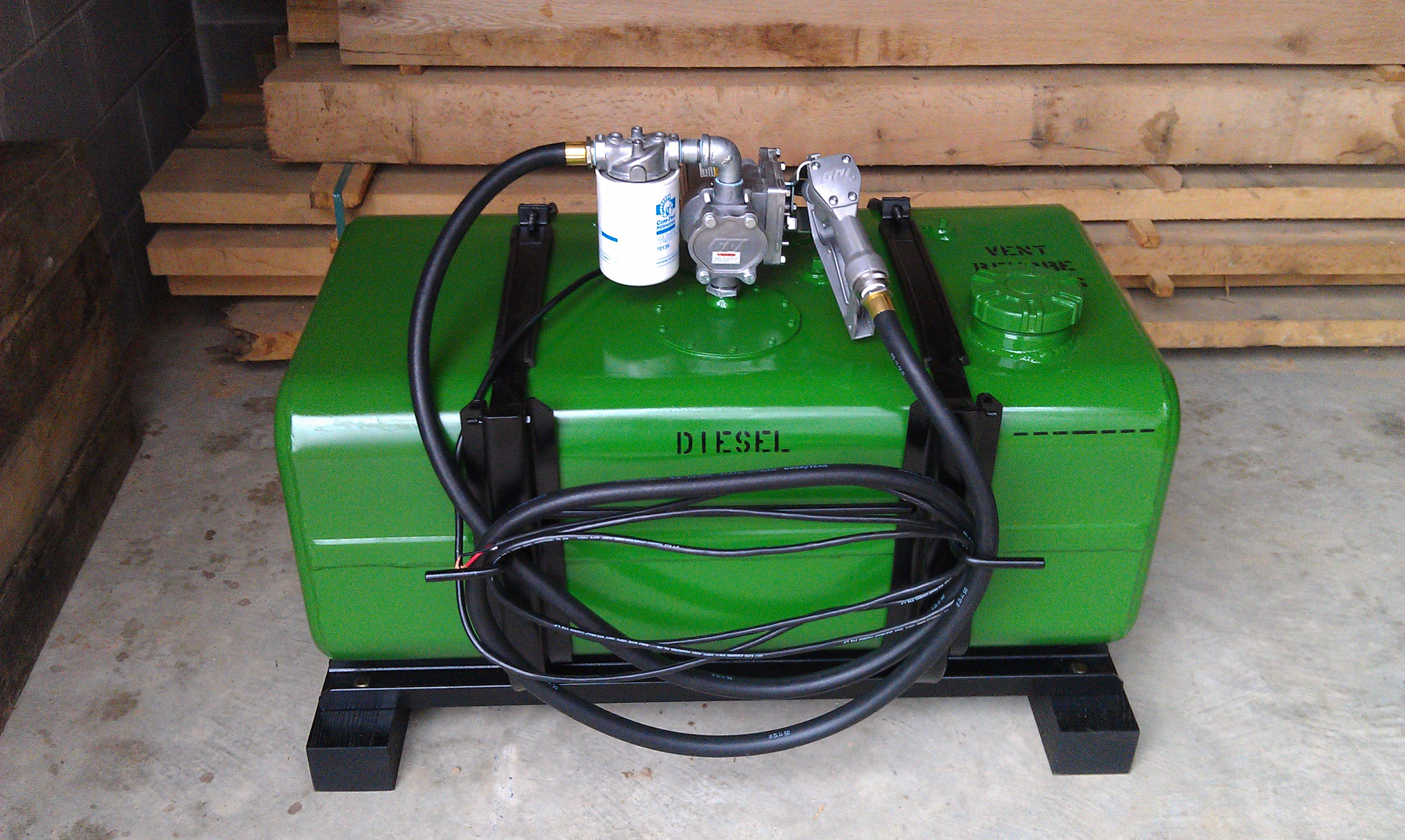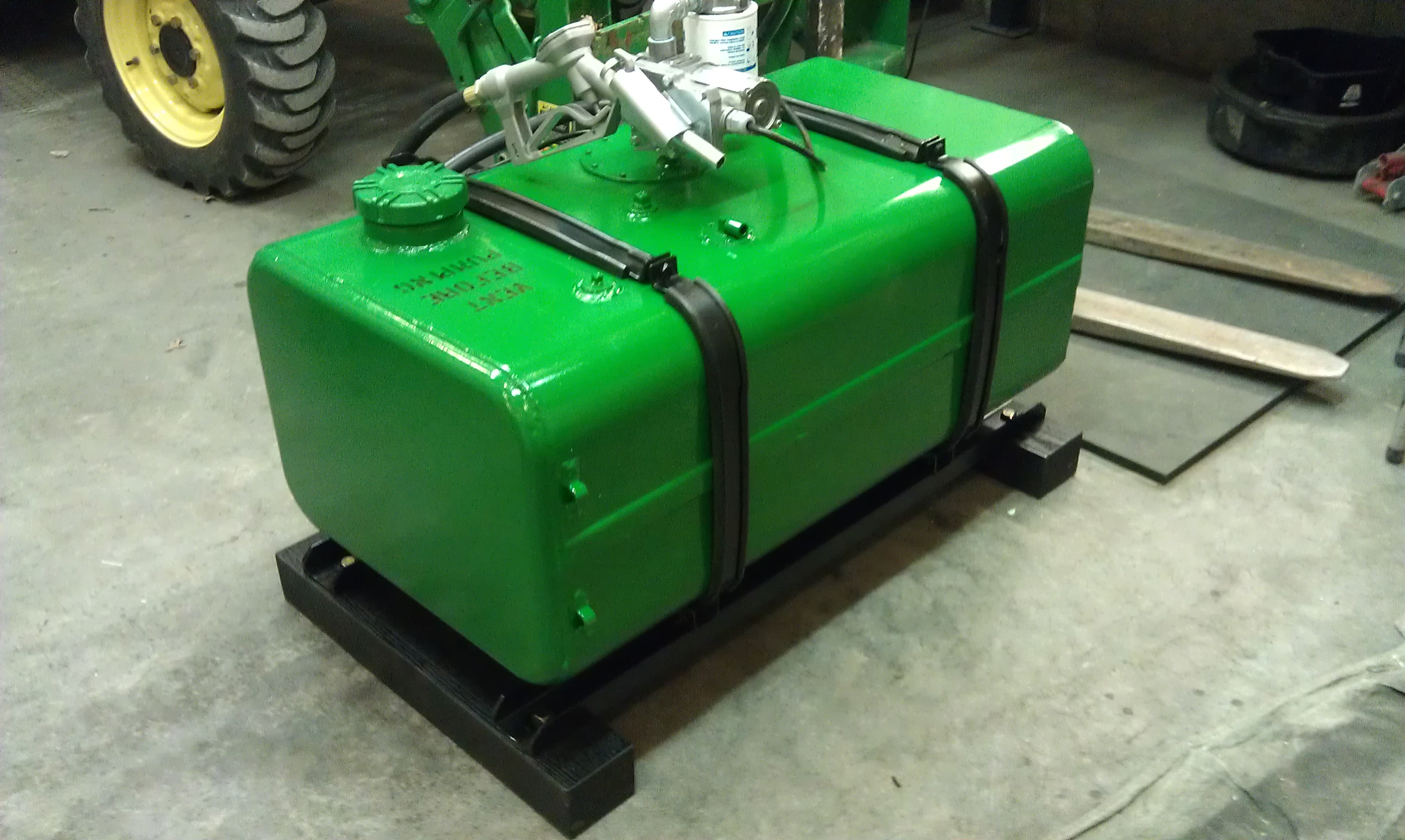 I just fork it around and it is super stable. I only really fork it to and from a rolling cart to my truck and back. I also wired quick connects to both tractors and put the matching end on the pump power lead so all I do is wheel the cart next to the tractor and plug the pump into the tractor battery and fill up.