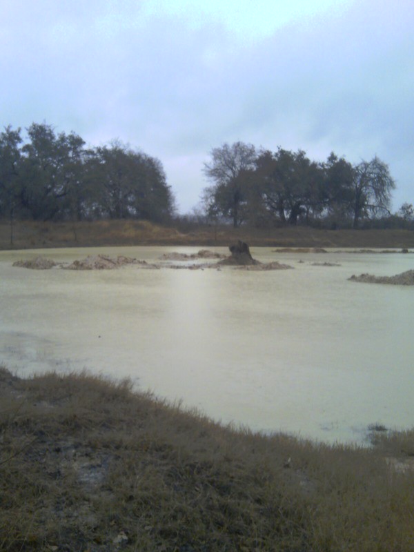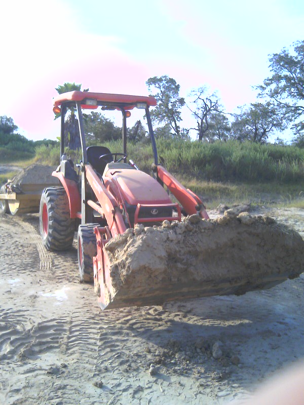 Man has it been a while since I posted, although I still actively visit the site daily. I thought I might include a few phone camera pics of the L39 and Durabuilt dirtpan in action for those who have an interest in pond excavation. I purchased this tractor new 15 months ago and now have 1000 hours in road building, rotary cutter, tree removal, trenching and pond digging. Before the L39 I had a B26 for 1 year and logged 500 hours on that unit..so I get a lot of seat time. The photos are not that great but you can see I also added a Kubota 4 n 1 bucket and it sure helps with back dragging and hauling logs and brush. The pond now stands at 2 1/2 acres that have been excavated. I do not know how many yards but it is tens of thousands over the last couple of years. I dam off the finished sections with sand bags and let them fill with rain and underground well water as I go. The shallow areas are 2-3 feet and the deepest area so far is 14 feet. This is some tough clay to dig so I use a combination of the backhoe, box blade with rippers and dirtpan scraper. With the dirtpan and the loader bucket full I am hauling about 2 yards at a time and spreading about 100 yards away. The dirtpan sure has sped up the process. If anyone has any questions about the L39, Kubota 4 n 1 bucket or Durabuilt dirtpan on this size tractor, I will be glad to answer any question I can.