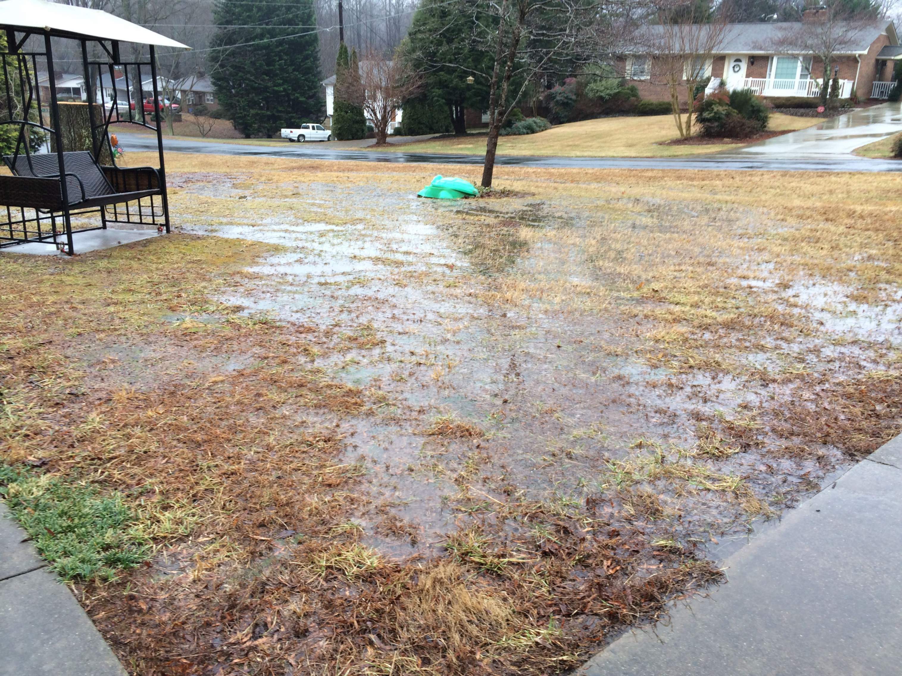 In one photo it looks like you created a dam with your sidewalk and didn't provide a drain under it. This might be fixable by digging down and then driving a 4" drain line under the sidewalk. It is really hard to tell from just a few photos.