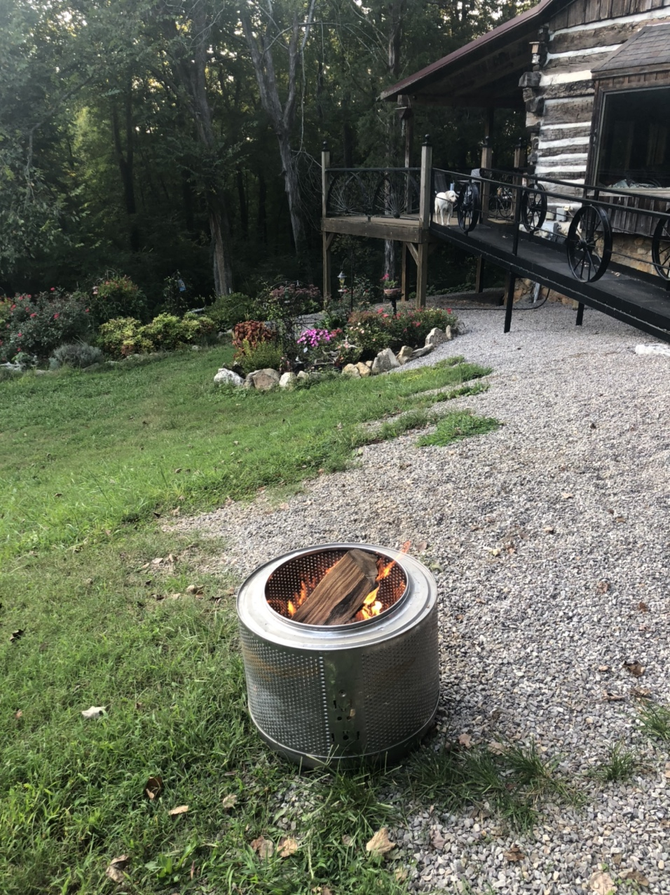 Trying out a SS clothes washer tub for fire pit. Found a commercial SS stock pot lid to cover it. Good thing it is smokeless and easy to cook on.