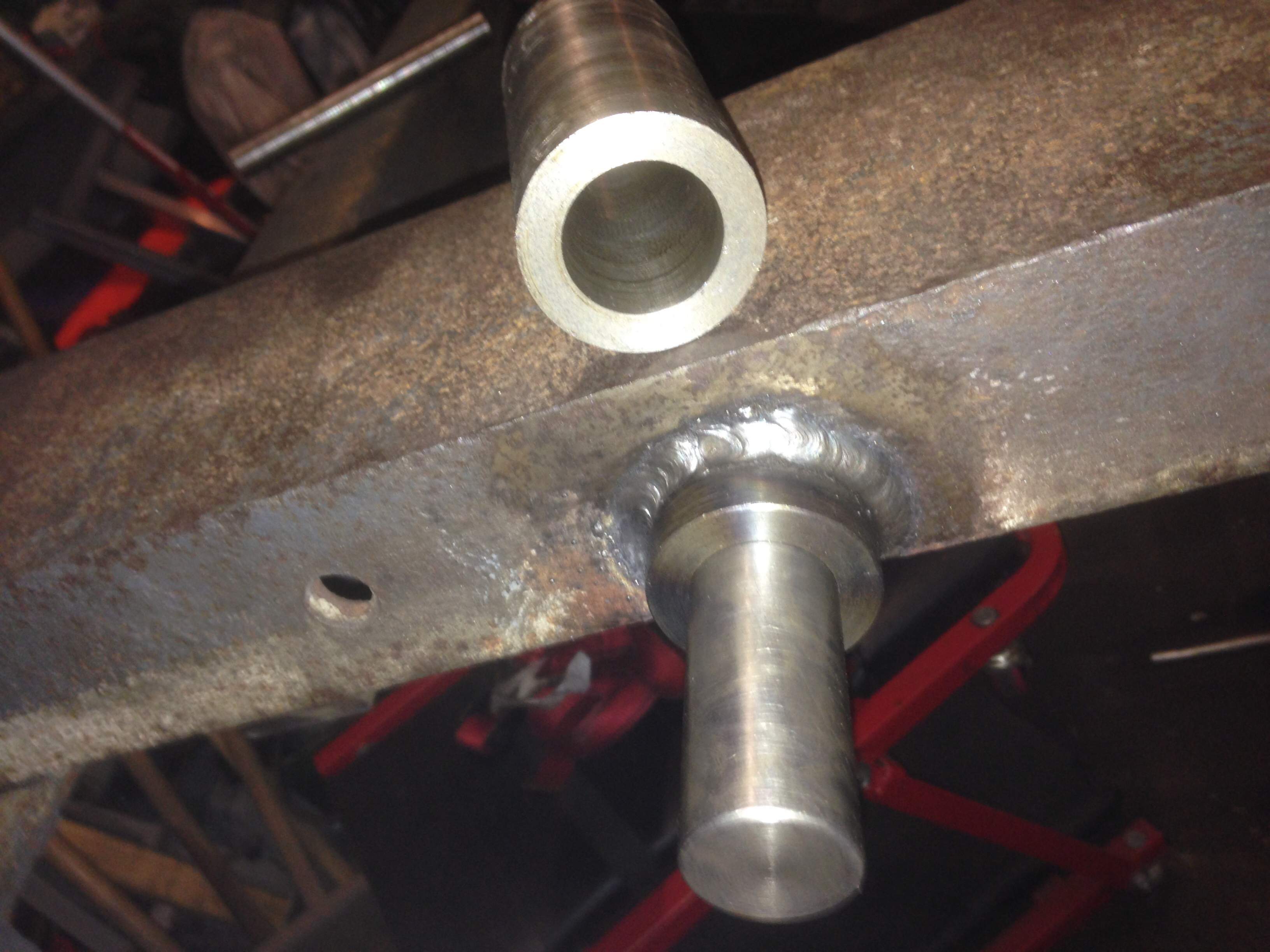 Backhoe pivot is starting to take shape. 4" x 2" x 1/4 hollow section 30mm pins and 48mm bushes. Grease nipple clearance tubes welded in place.