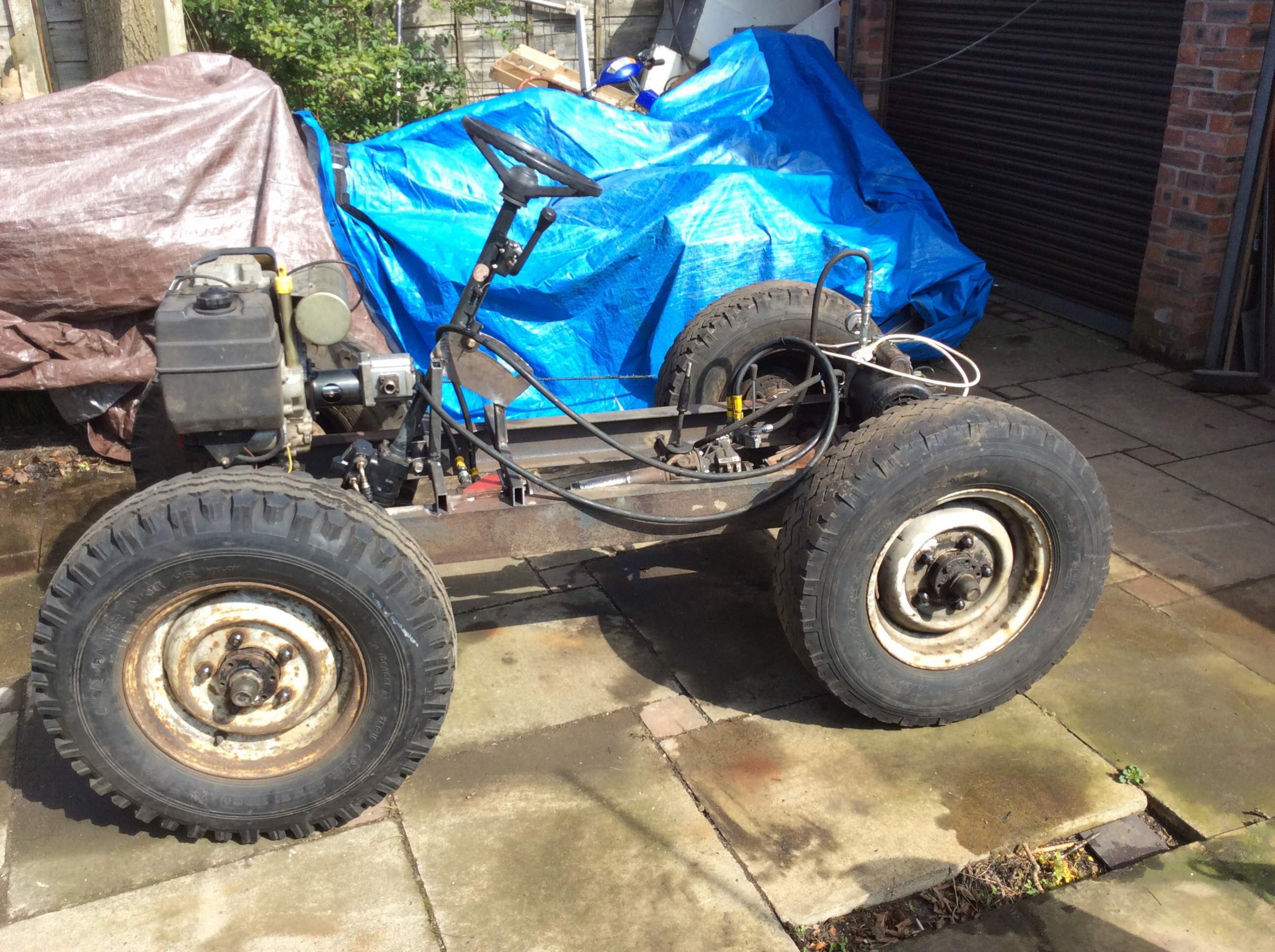 One of the 2nd hand hydraulic motors I bought off ebay earlier this year came with a substantial mounting bracket which fits nicely against the chassis. The motor adapter to fit the Suzuki flange was straightforward to make and the propshaft just need shortening and welding back together.