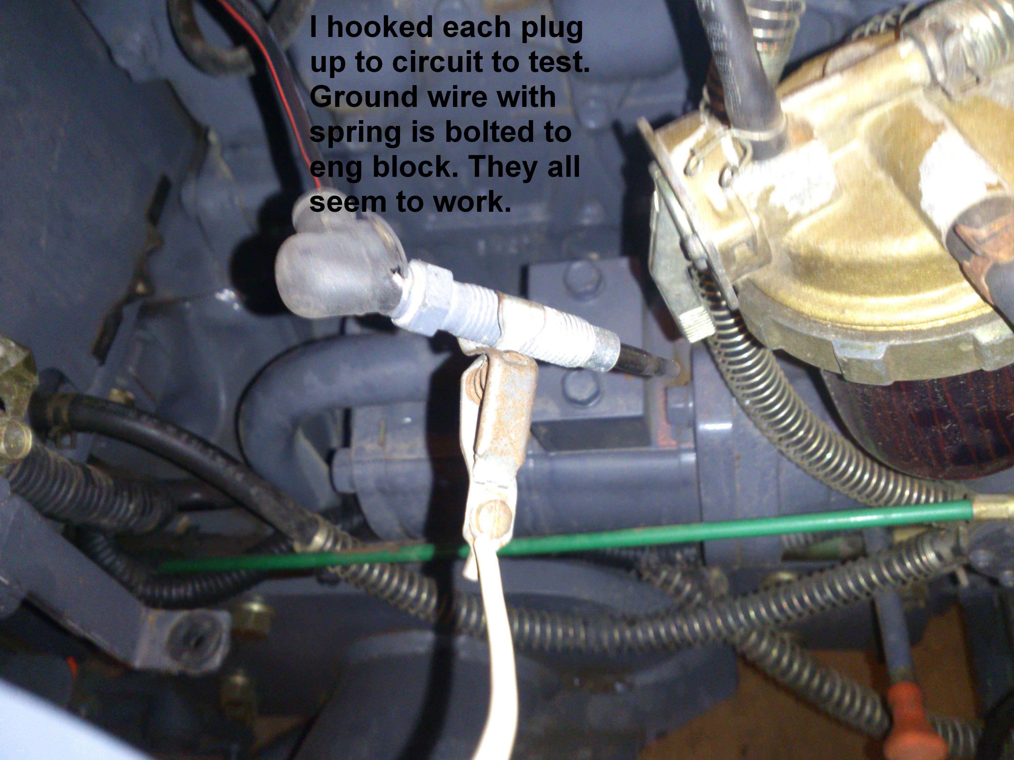 I do not have a shop manual. I know I should, but I don't. So to test glow plugs I cleaned up electrical terminal, and attached to each glow plug one at a time. I also made up a wire with spring clip terminal to attach to plug body and bolted it to block. I just turned the key for a second or two and each plug produced smoke at the tip. Be careful as the plugs can get very hot. I never left key on long enough for the body of plug to get more than warm to the touch. I think I now know I have good plugs. I also wanted to ck plugs for carbon build up as another thread involved head removal with a broken plug tip. I had just a light coating of soot after 850 hrs.