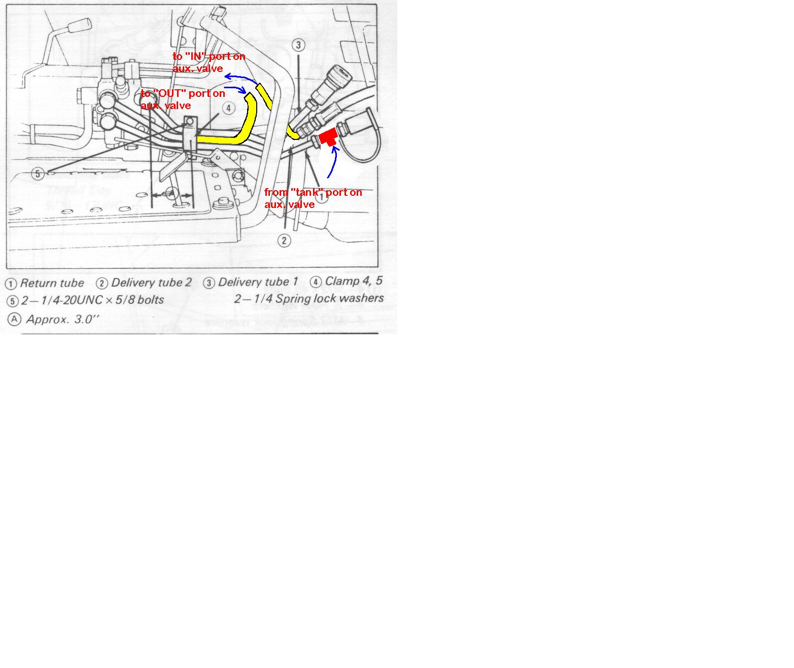 First, I scanned a page from my tractor's operators manual. The block described on this page is the only place (that I can see) that I could tap into hydraulics. The top two smaller ports are being used by power steering. The 3 ports on the face of the block are being used by the FEL valve. If I wanted to add more valves without tapping into the FEL's PB port (the valve is attached to the loader frame which can be removed), I guess I will have to tee off those three ports. Is that right?