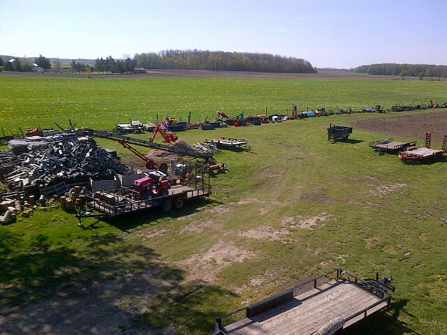 Tough to see well in this pic taken from the roof of my barn. Conveyor is an old grain elevator. Spitters are a speeco 28 ton, a shop built vertical 20 ton , a gilson whatever and a unicorn killer. I have a couple stihls.