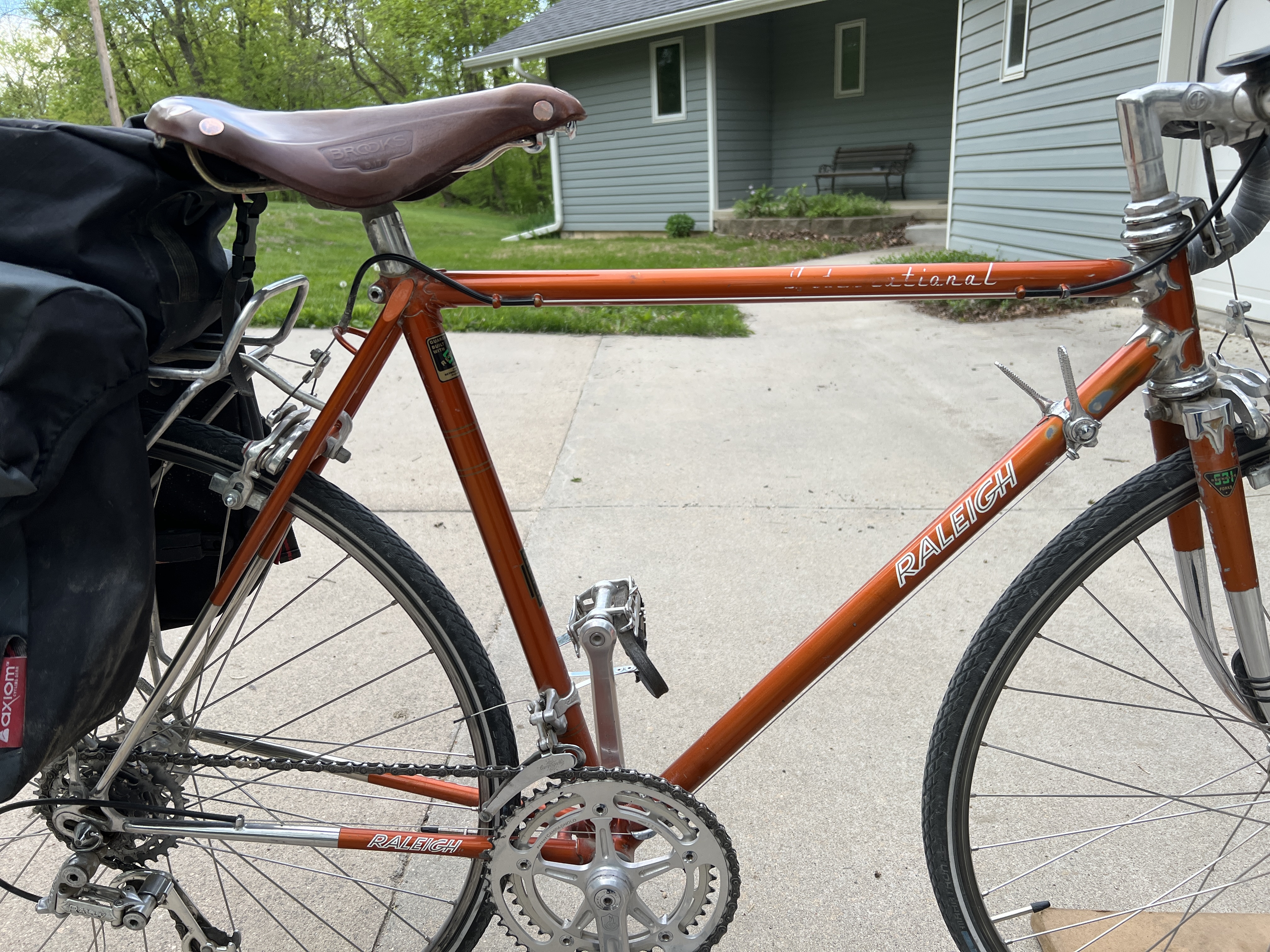 This beauty is an REI/Novara Randonee I bought new in 1997. I was 25. I've worn out a set of wheels on it, I figured they lasted 20-25k miles. Wore out an RSX drivetrain on it and started an experiment. Put a Surly crank and stainless single chainring up front and 8 speed in the back. Simple downtube shifter. My favorite 2-3 gears almost perfectly aligned for mostly flat riding along the parkway in DC. This bike fits like my favorite pair of pants. You can see both bikes have racks so you can drop your Ortliebs on there with all you need for the office.