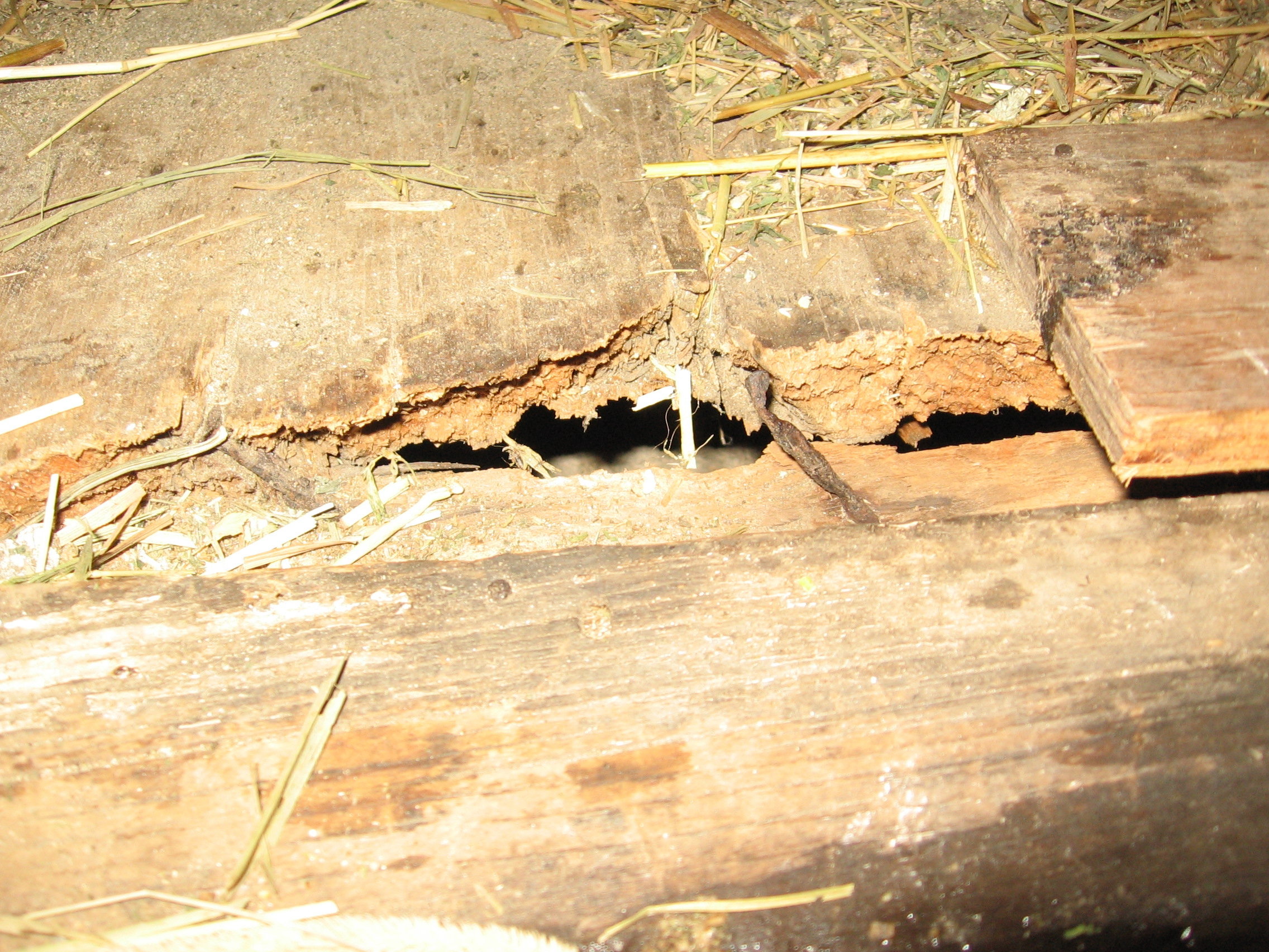 Closer examination of outhouse floor revealed that the perpetrator chewed his or her way through to get to their prey. It looks like the little sucker has taken up residence in the barn under stacks of hay. We set a trap using ground beef 2 days ago but no takers as of yet.