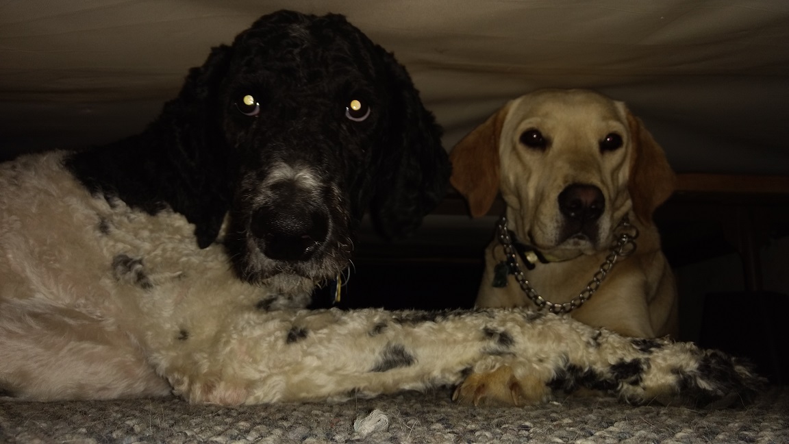 excuse me....how about a little privacy......:laughing:......had a pyr who was afraid of thunder and I was always amazed at the places a dog of that size could get in to.......he tried hiding under the bed once and couldn't get out.....had to disassemble the bed and frame to remove him.........Jack