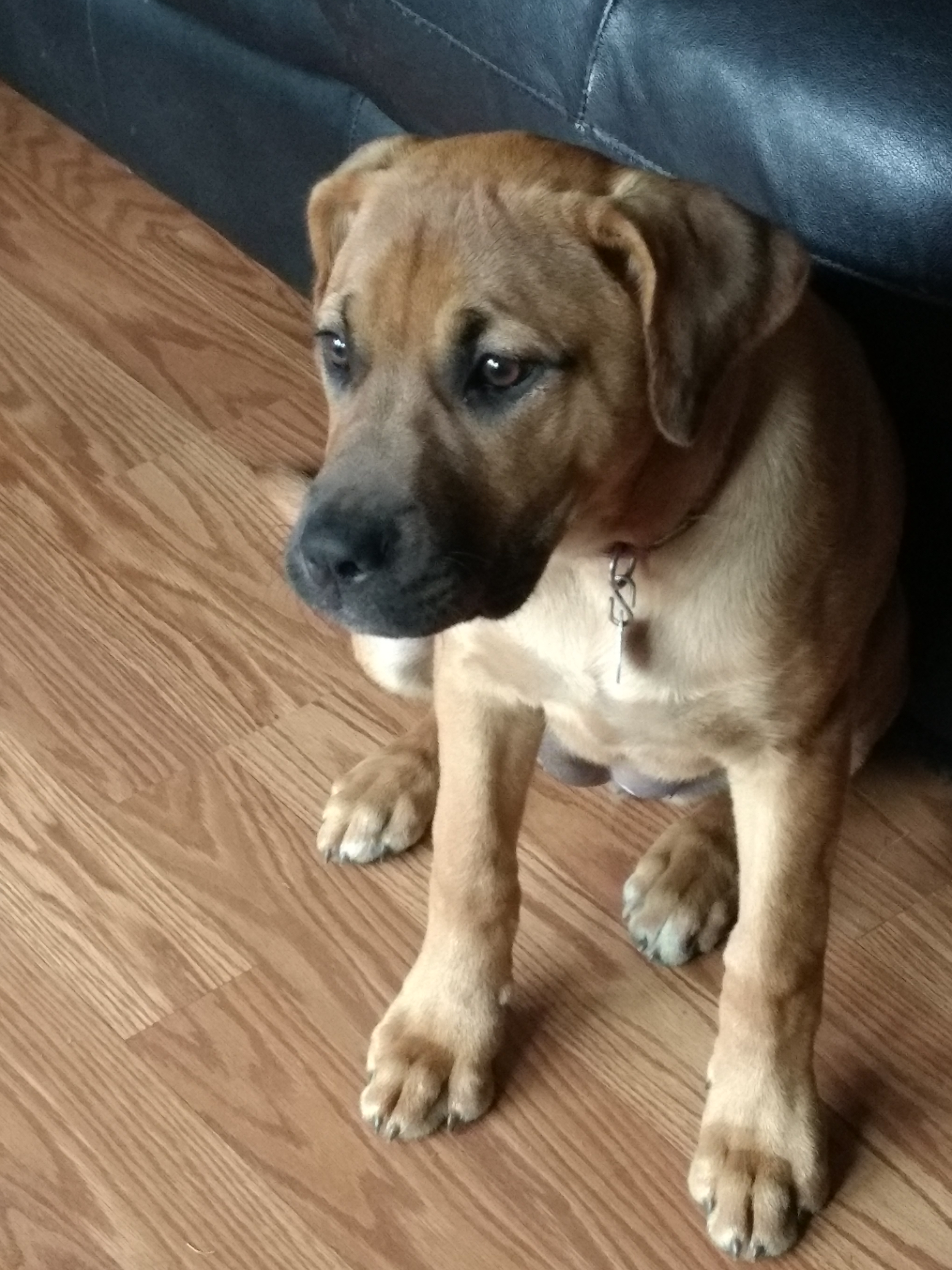 Taken at four months, this one shows more of the Mastiff-Lab side (puppy look is diminishing):